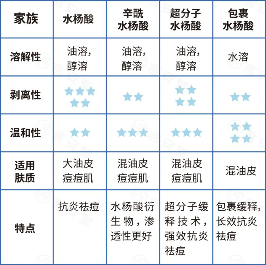 -β-羟基酸(BHA):最早发现于柳树皮,冬青叶和桦树皮,比较典型的例子是水杨酸。水杨酸等BHA具有脂溶性,能更好地渗透肌肤,起到缓释作用,并且更容易进入油脂丰富的毛孔皮脂腺内,清除堵塞毛孔的角质。