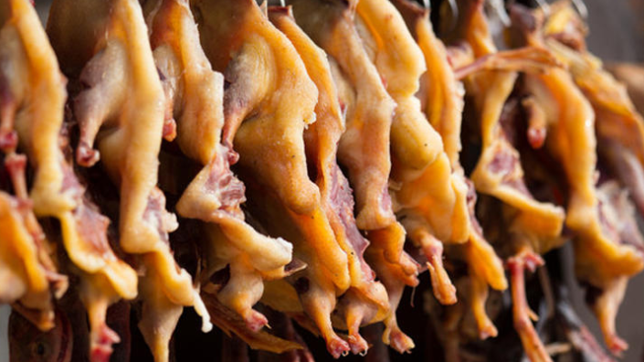 散养长大的鸡,体态也更壮硕,只有这样的鸡经过20天风干卤制后,还能重700克。