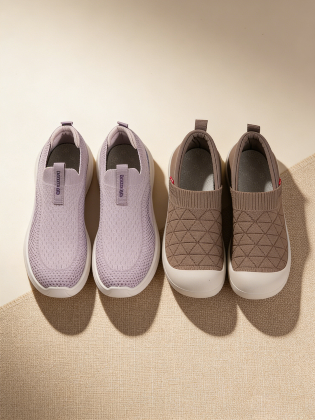 款式一主打轻盈,款式二主打软弹缓震。两款都是飞织一脚蹬,但各有各的“绝活”。
