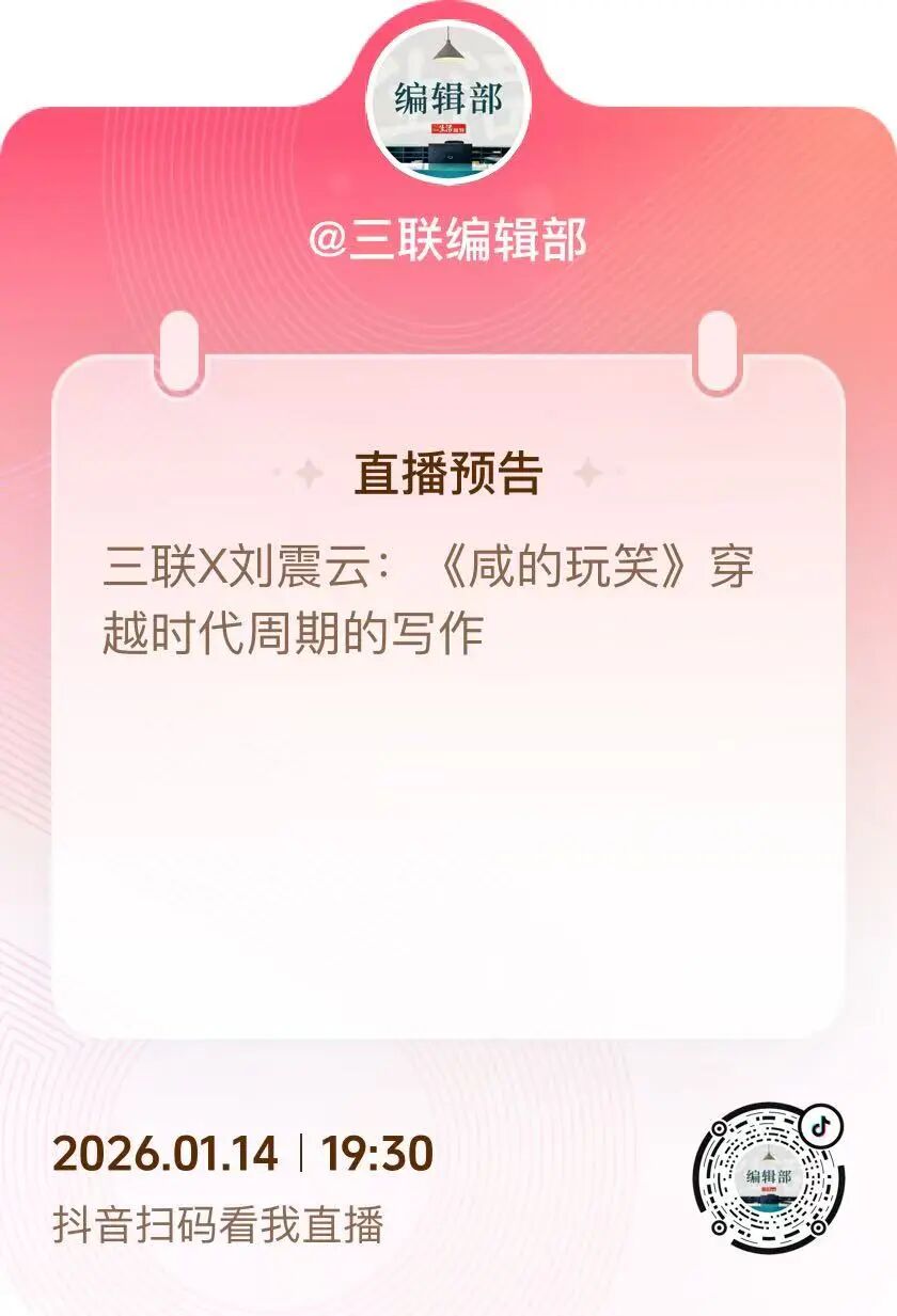 1月14日(周三)晚7:30,刘震云老师携新作《咸的玩笑》,做客《三联生活周刊》直播间,与周刊主编李鸿谷一起展开一场精彩对谈。这场对话不止于新书解读,更关乎每个人都要面对的时代命题:如何在变化中保持韧性,如何把生活的苦涩酿成回甘。