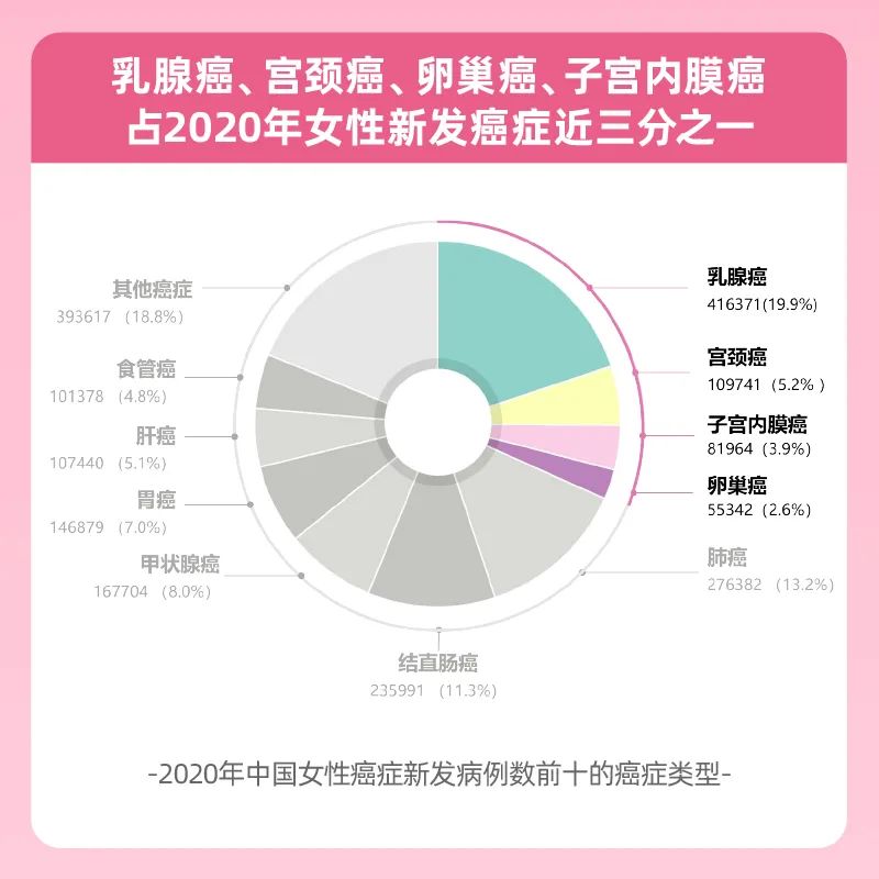 根据国家癌症中心报告显示,乳腺癌、宫颈癌、子宫内膜癌、卵巢癌是目前我国女性群体中发病率最高的四大恶性肿瘤。其中,女性发病首位为乳腺癌,每年发病约为30.4万;其次为宫颈癌,每年发病约11.1万;而卵巢癌致死率最高,5年生存率只有不到30%。