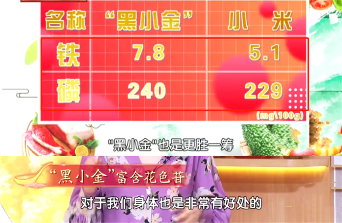 ② 矿物质含量更高:同时黑小米中还含有丰富的矿物质,它的铁和磷元素(辅助补钙)都比黄小米高。
