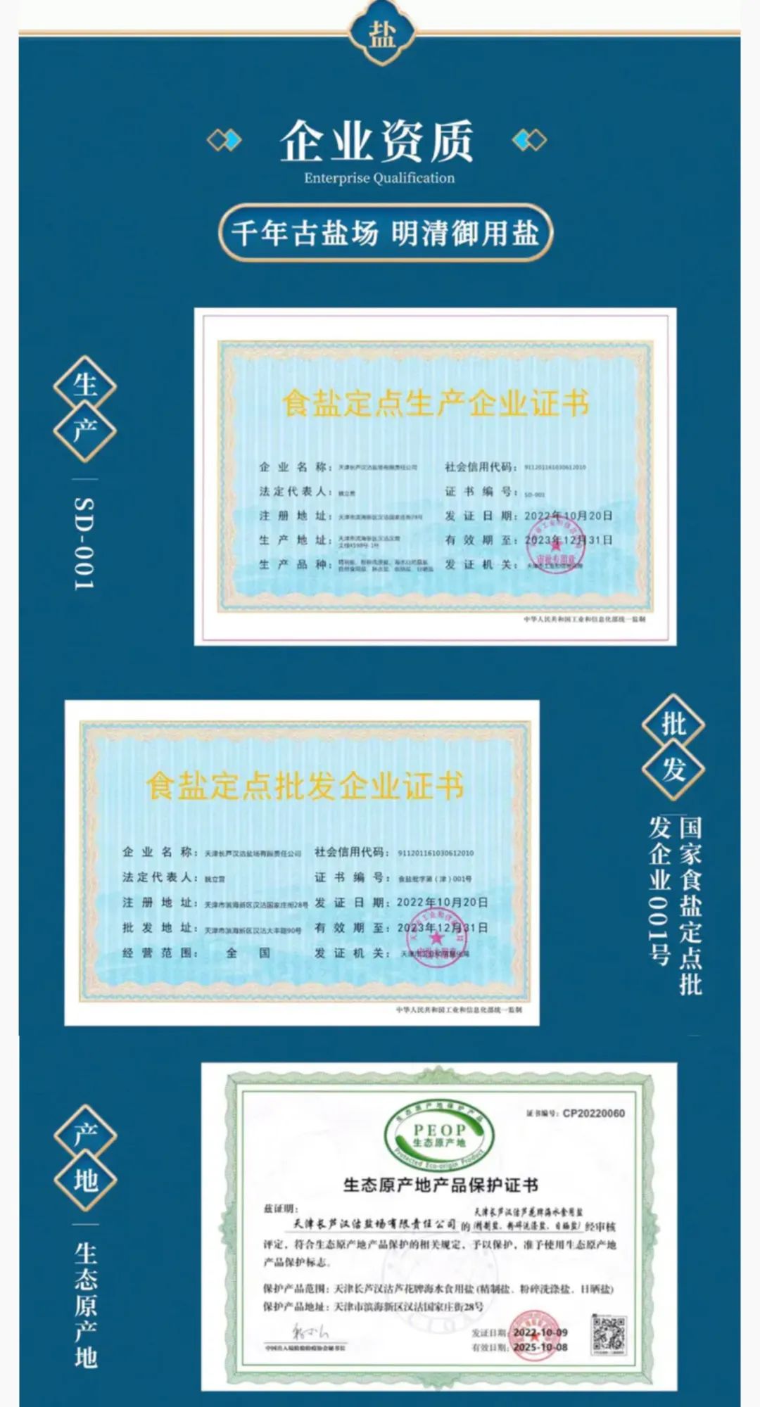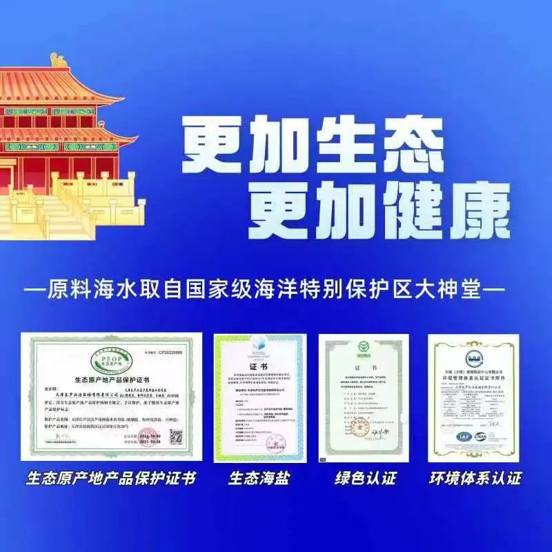 并取得ISO9001质量管理体系认证和ISO22000食品安全管理体系认证,是中国食用盐行业具备“生态原产地产品保护证书”的食盐生产企业。