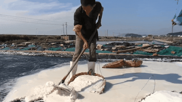 他们的滩田采用天然泥沙铺地,微生物与微量元素丰富,造就了芦花海盐别具一格的鲜美风味。