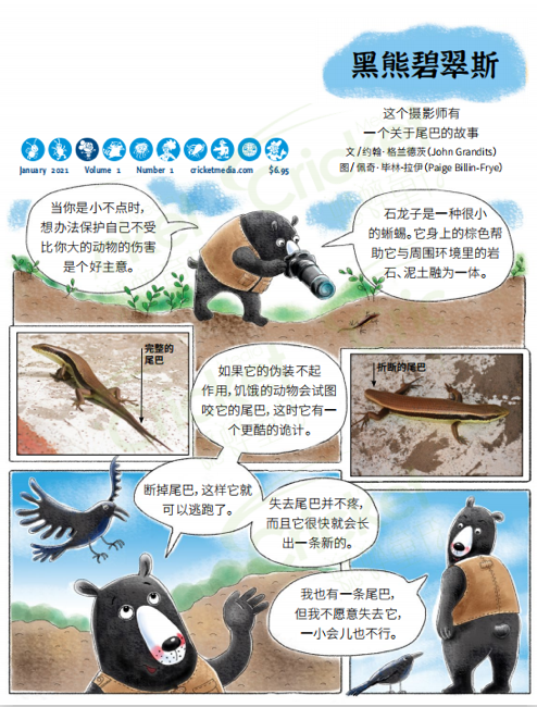在美国,每年5月下旬到8月是漫长的暑假,也是孩子们走出封闭的校园,投身自然和世界的大好时光,编辑部认为,这是孩子们成长过程中不可或缺的部分,学习并不仅仅限于书本和教室;每年的11月12月,会迎来西方传统的感恩节、圣诞节,这是家庭团聚的日子,也是孩子们体会亲情、学会爱与付出的好时光。因此,Cricket Media的所有杂志都是5/6月,7/8月,11/12月合刊。让孩子、父母以及编辑、编辑的孩子们都尽情享受户外时光、团聚时光。我们输出的不是负担,而是享受,享受新鲜活泼的世间万物。