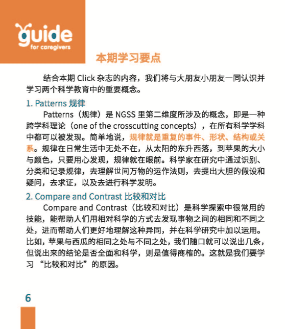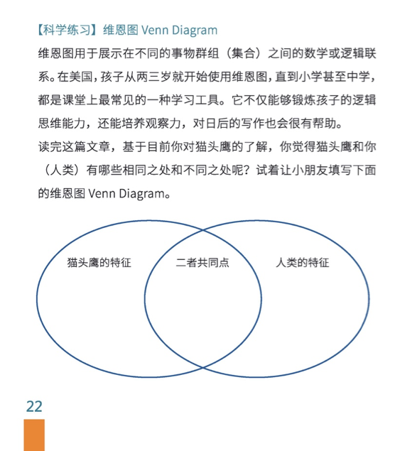 这套杂志每期还配有由美国教育专家研发的《家长阅读指南》,干货满满,能帮助家长更好地指导孩子学习。比如,这套杂志中的《家长阅读指南》,会指导家长通过和孩子参加“科学观察月相活动”,教孩子认识“规律”这个重要概念,同时培养热爱观察的好习惯;用维恩图去挖掘事物之间的异同点,在了解“集合”这个数学概念的同时,学会理清事物之间的关系;去区分哪些表达是事实(fact),哪些表达是观点(opinion),从而更好地培养批判性思维。