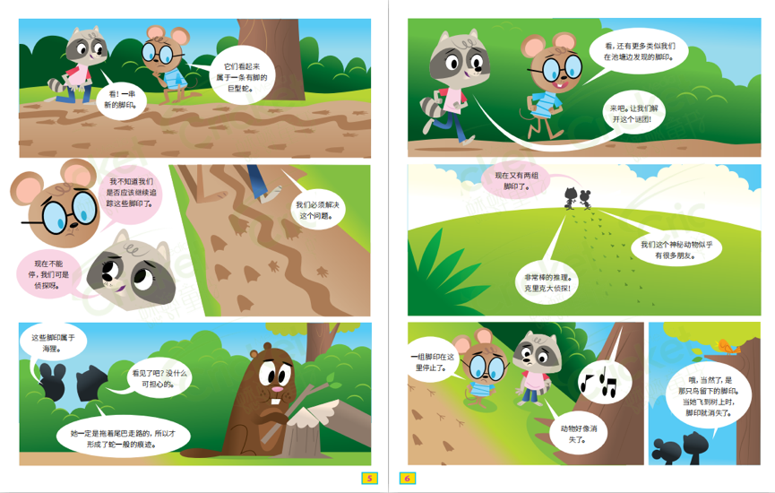 接下来是“小鼠克里克和小浣熊珍”连载漫画栏目。它通过一个侦探故事,引导孩子去探究不同动物的脚印和行走方式。在两位漫画主人公的对话中,孩子也能潜移默化地习得观察、猜想、对比、排除、推理等重要思维能力。