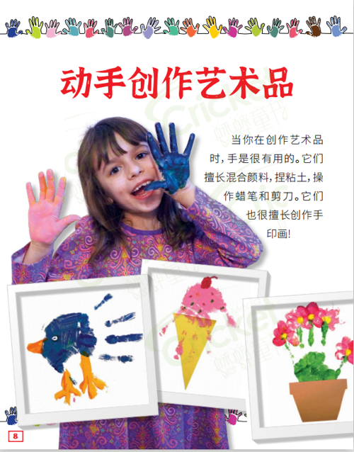然后是一个和手有关的动手创作游戏,它启发孩子们去思考手在艺术创作中的不同作用,让孩子们放飞想象力和创造力,尝试用手和其他材料去创作手印画。