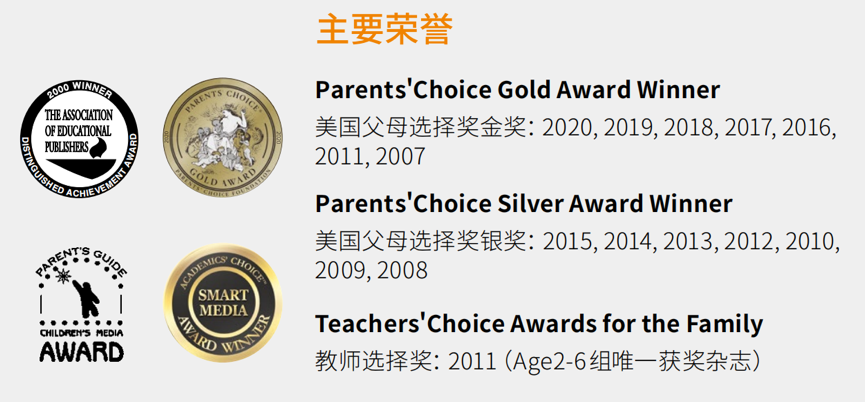 凭借卓越的内容品质,Cricket Media在北美获得过美国父母选择奖金奖、美国国家亲子出版奖金奖等14项儿童出版类大奖,被誉为“世界上获奖最多的出版机构”。