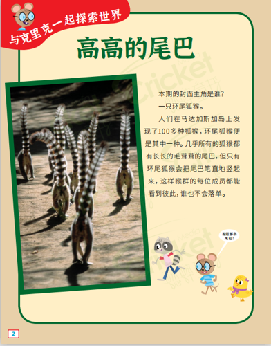 比如2020年9月刊《稳住!手,脚和尾巴》,主题是“手,脚和尾巴”。于是,开头的“与克里克一起探索世界”栏目从封面主角环尾狐猴高高的尾巴切入主题,激发孩子的好奇心。