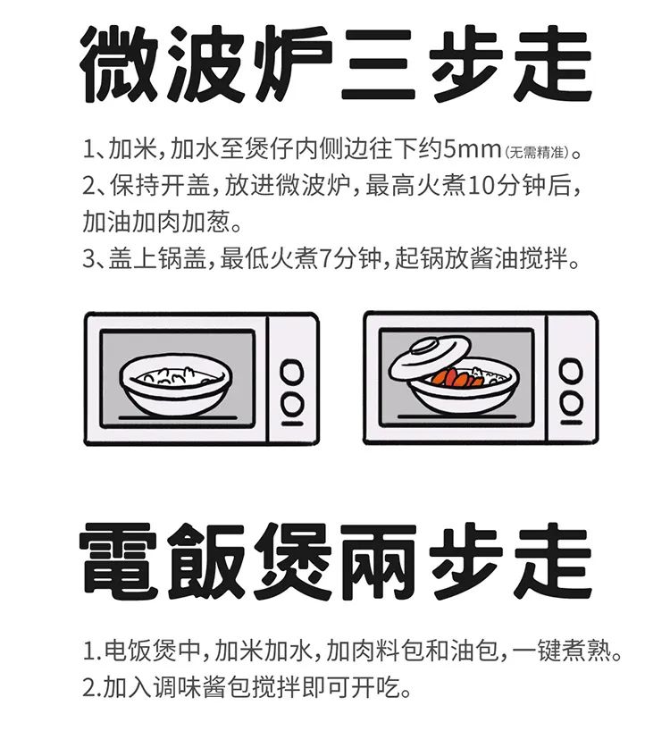 除了明火烧制,这款煲仔饭,同样也可以用微波炉、电饭煲来做~