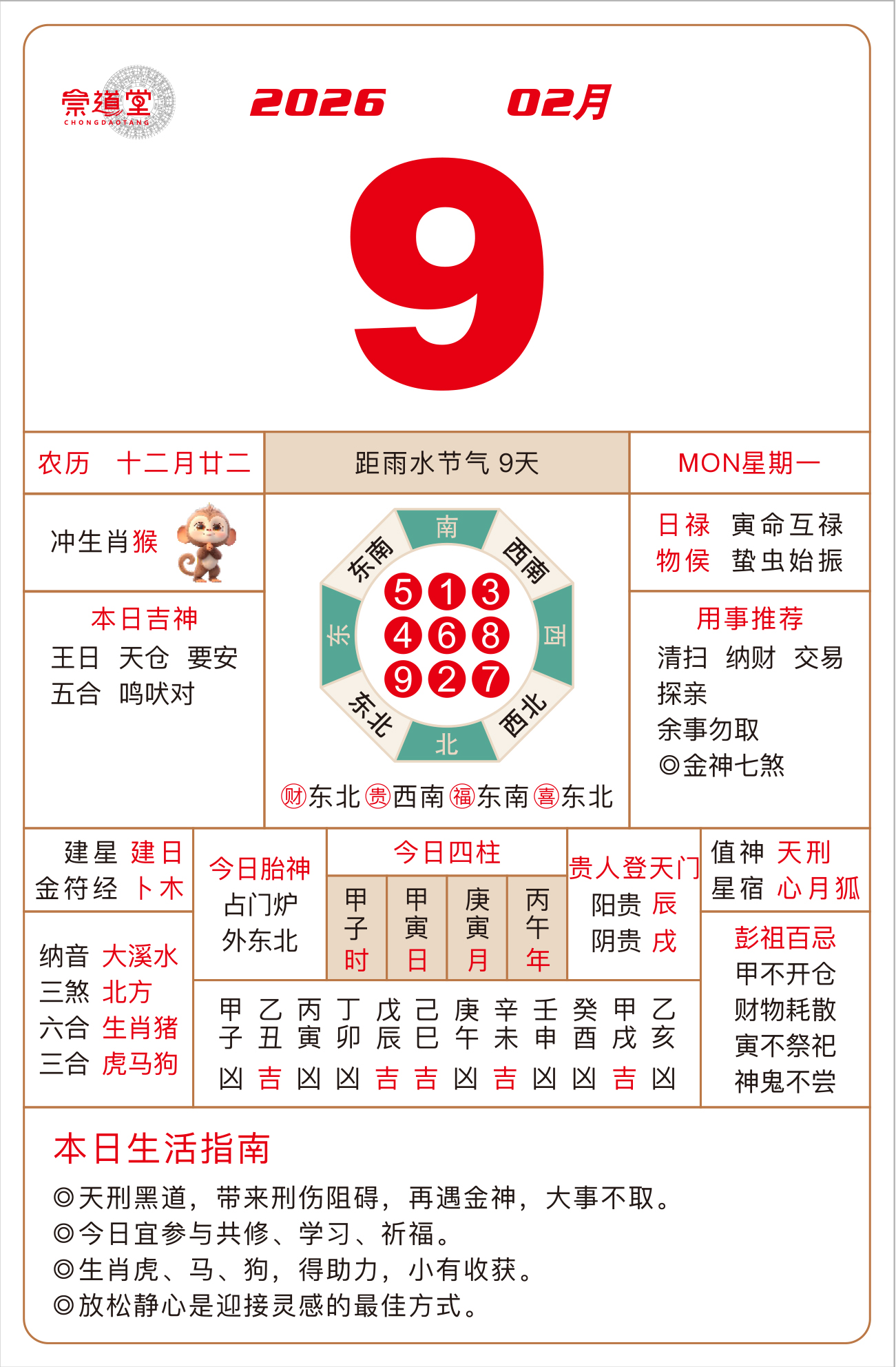 己巳、戊申、辛巳、庚申等日主,今日宜静不宜动,建议静坐冥想、焚香抄经,尽量心平气和。