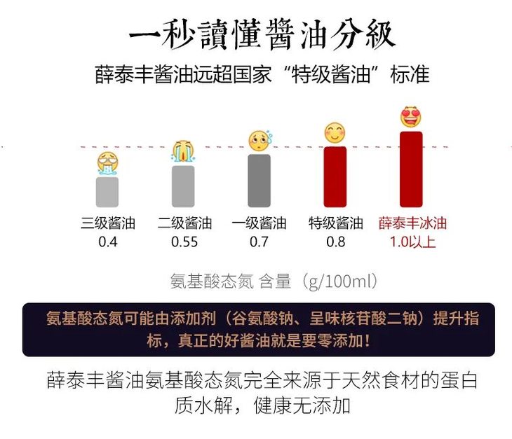 薛泰丰达到了1.1-1.4的级别,比特级酱油的标准更高,味道鲜香醇厚,用它炒菜,满厨房都香了。