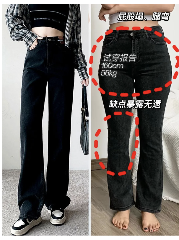 同样的裤子,在模特身上能穿出令人羡慕的身材,但到了咱普通身材上: