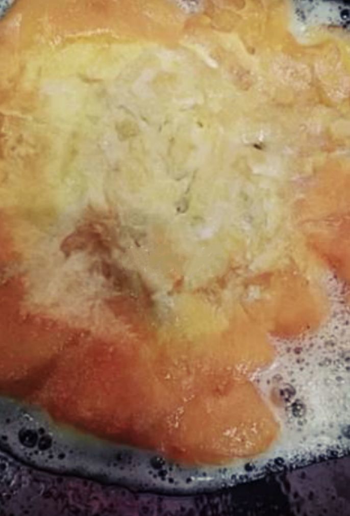 3、鸡蛋羹呈半凝固状态时,将其翻转过来,双面煎成金黄色,盛入盘中;