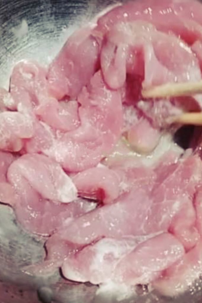 2、将里脊切成薄片,放盐、白胡椒粉、1勺鸡蛋液、1小捏淀粉,抓匀备用;