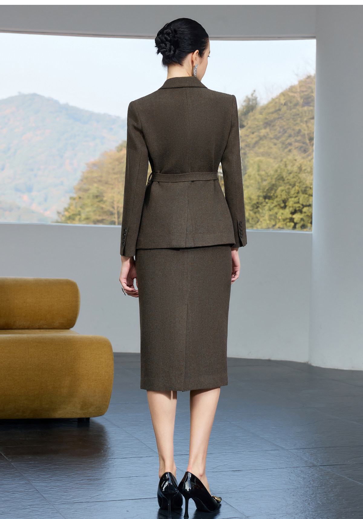 深棕羊毛混纺的肌理里,藏着秋冬的高级质感。人字纹暗纹像把温柔揉进沉稳,一触就暖的面料,是通勤里的 “隐形舒适圈”。