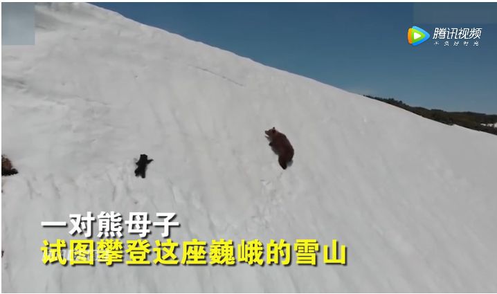 如果只是熊孩子练习爬山,恐怕还不至于这么火。主要是在爬雪山的过程中,熊妈妈做出来的动作和反应。