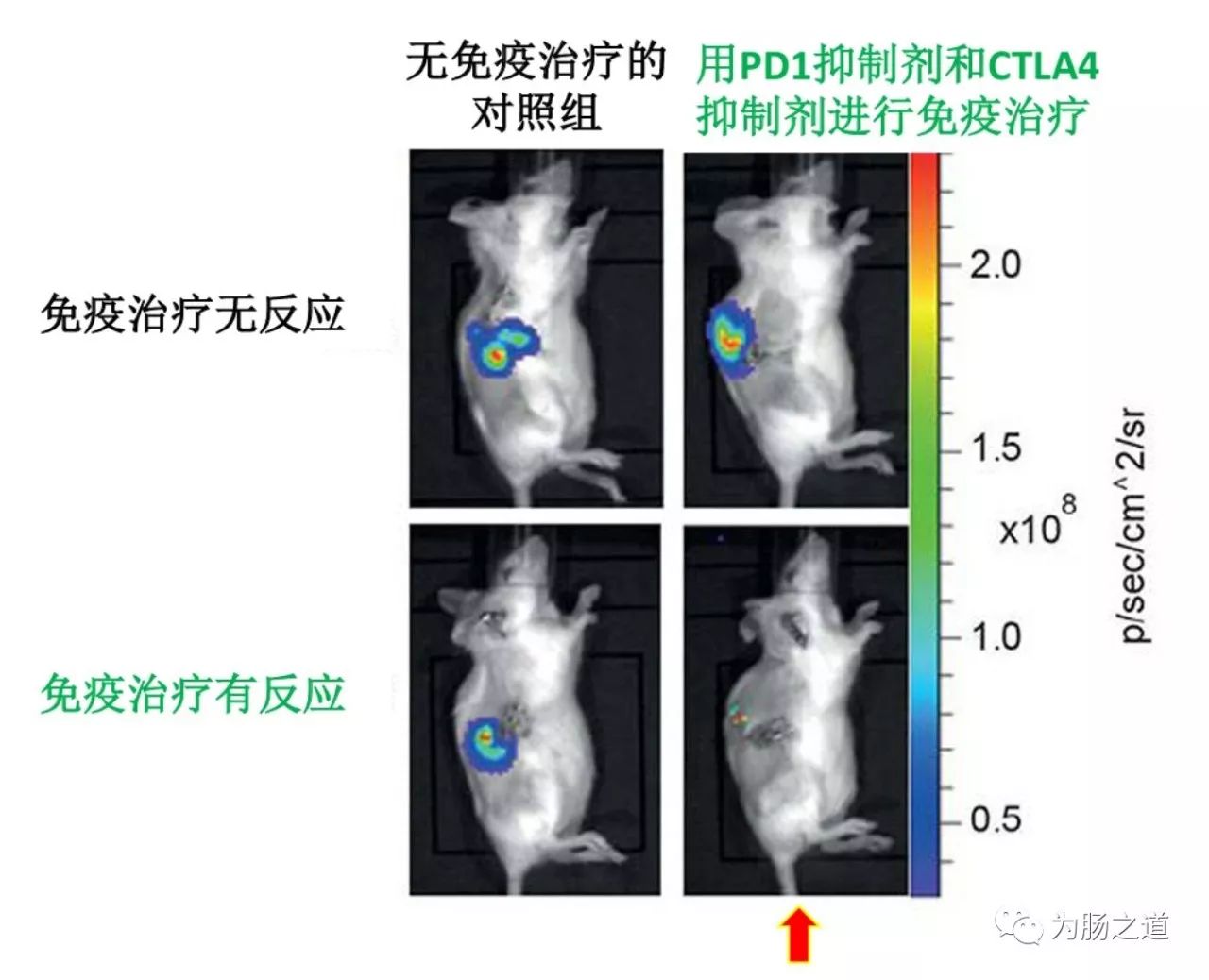 红色箭头显示,来自免疫治疗有反应的病人的肠道菌在移植给无菌小鼠后,再用免疫抑制剂来治疗小鼠,小鼠体内的肿瘤几乎完全消失了!