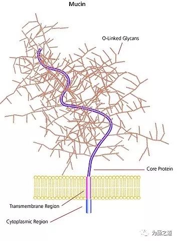 粘蛋白是一种高分子的糖基化蛋白质,非常富有粘性。在动物的胃肠道表面有大量分布。它们是由肠道的上皮细胞分泌的。