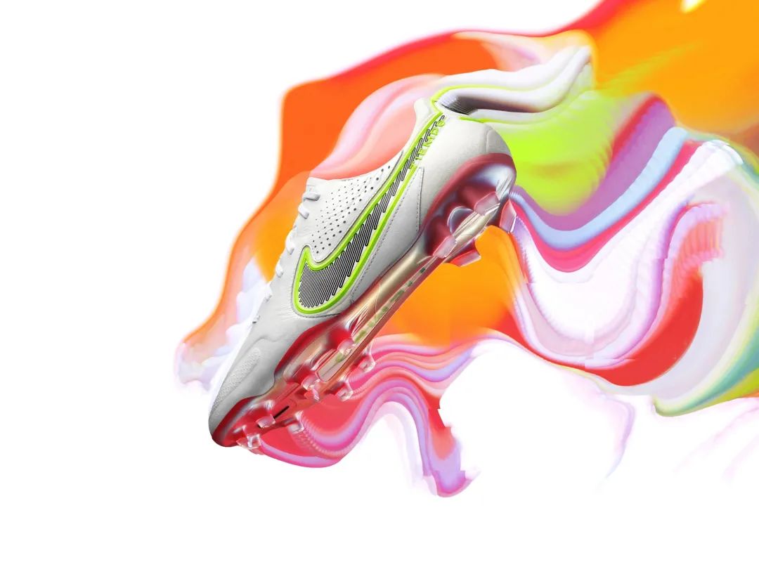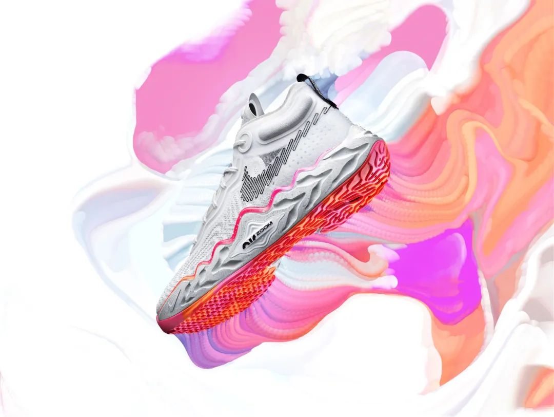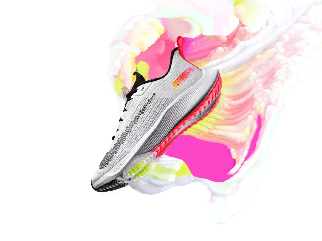 该配色以白色为主色,意味着和谐统一(它包括可见光光谱内的所有颜色光),以及万物归位。色彩的分布也像是某种信标,吸引着人们对于鞋类科技部件的关注。例如,在 Nike Air Zoom Maxfly 这样的竞速鞋款中,可视化的 Zoom Air 气垫单元以荧光绿色高调呈现,并辅以橙色的细节点缀与凸显。“与艺术中的留白手法类似,”摩尔说,“正是在白色的背景布之上,细节之处才能被完美展现。”