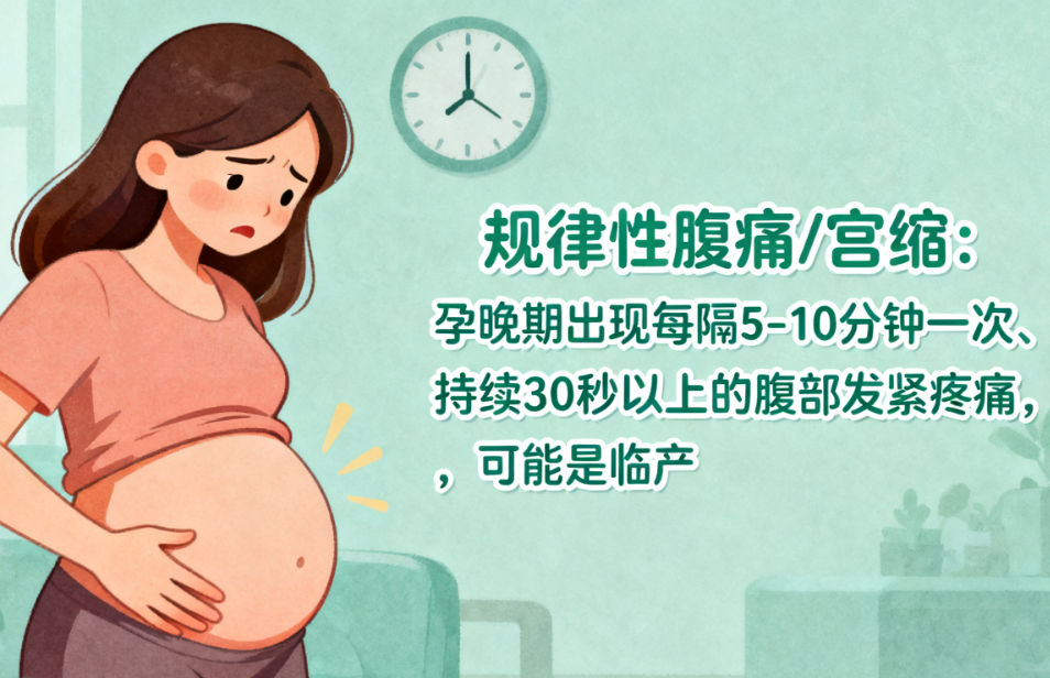 ①规律性的腹痛或宫缩:感觉肚子一阵阵发紧发硬,且间隔时间越来越短,强度越来越强。