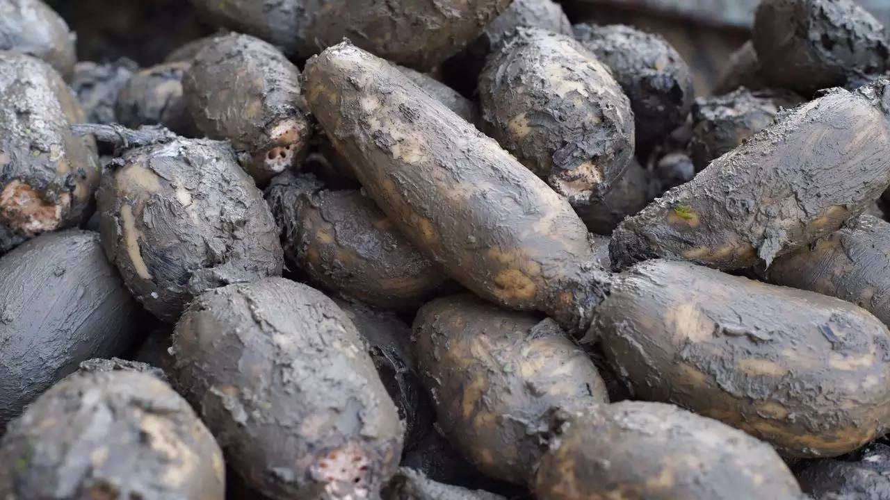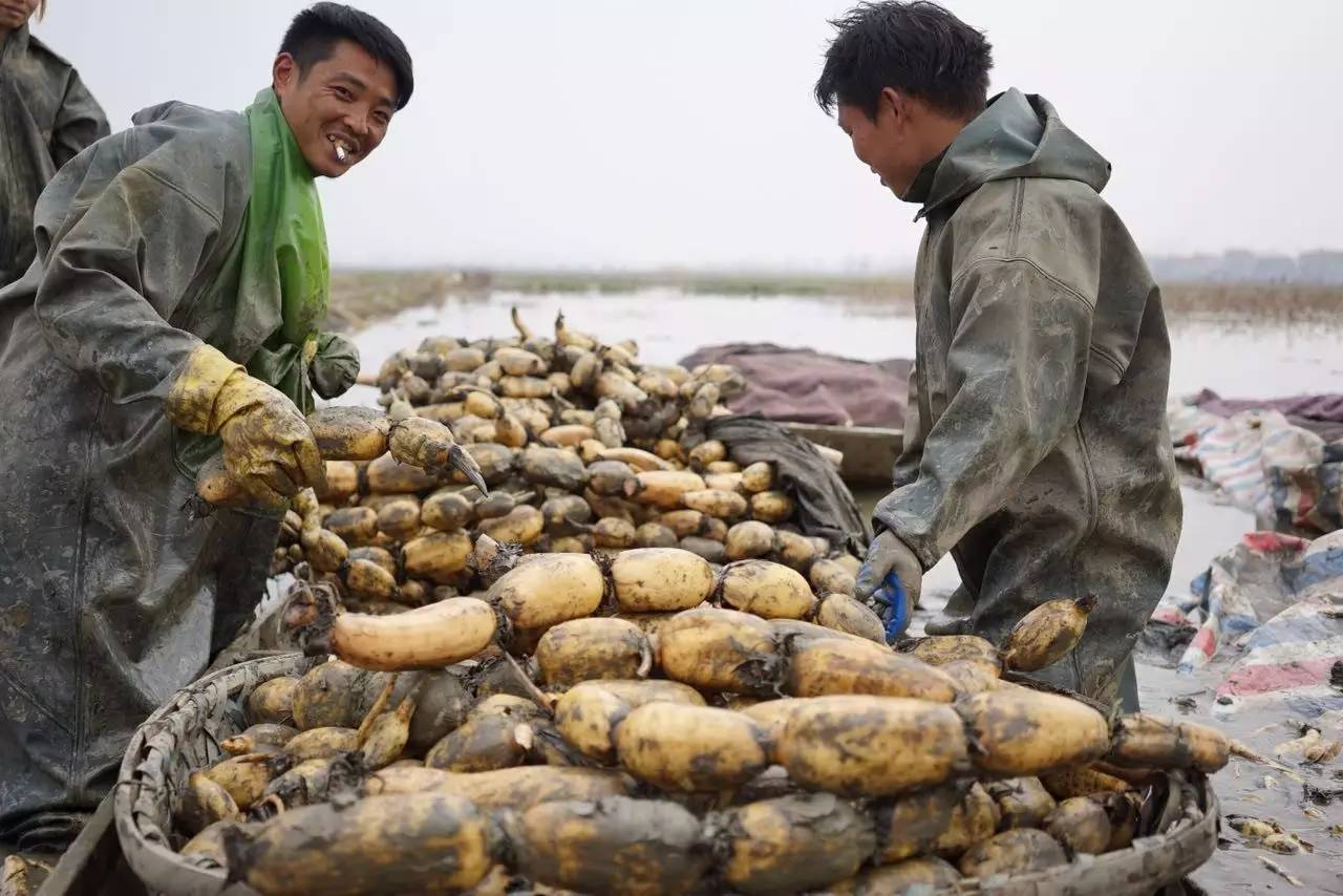 做藕粉的季节从每年十一月开始到来年的三四月结束。这个时候气温比较冷,采出的鲜藕淀粉含量高,天气一暖和淀粉就会转化成糖分。一般来说,百斤鲜藕可以制作出七斤左右藕粉,这个产量跟当年的气候也有很大关系。每当这个时候挖藕人就会从各地赶来负责挖藕,一个身手好的师傅一天可以挖二千斤藕。他们穿着连体服,先用柴油机驱动的高压水枪把藕从一米多深的藕塘的泥中冲出来,再一根根地把藕挖出水面,尽可能的保证藕的完整性。再冷的天气也是如此,相当辛苦。