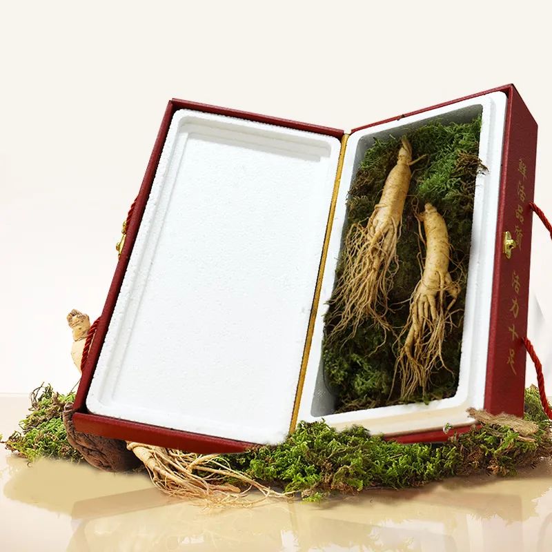 参农采摘之后直接用新鲜苔藓装入用保温泡沫盒,能够很好地保存人参的新鲜度,犹如在土地里生长。