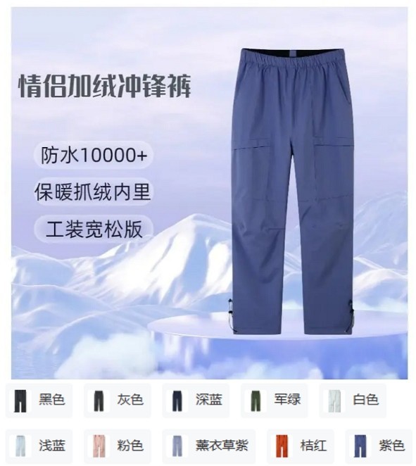 推荐理由:防水指数1W,外层防泼水,无惧中小雨~。PU透湿薄膜,拼缝处无缝压胶条,三重防水屏障!内层复合细腻摇粒绒,轻盈锁温!工装宽松版+膝部运动设计,户外运动无拘无束!
