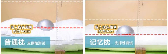 用铅球(7.26g)模拟人躺在枕头上,其陷入的深度体现了它的支撑力度,陷得越深力度越差!