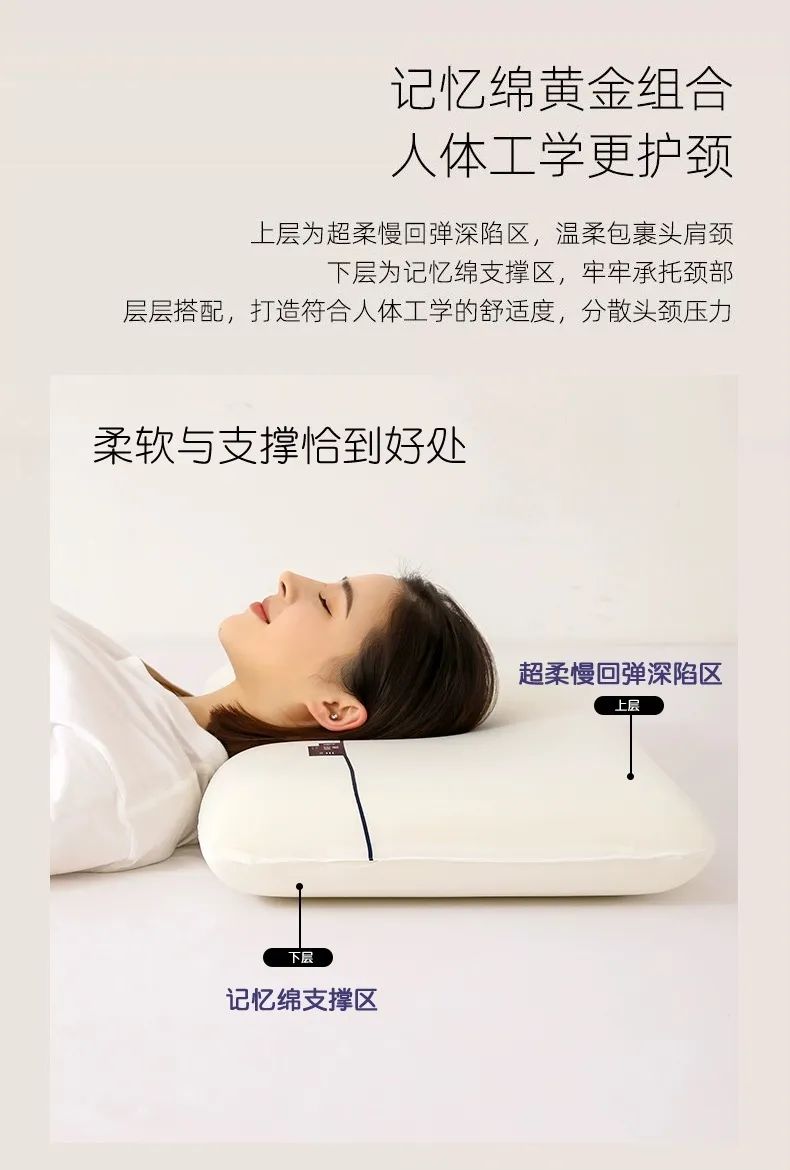 上层为超柔慢回弹深陷区,可以温柔包裹头部和整个颈部。
