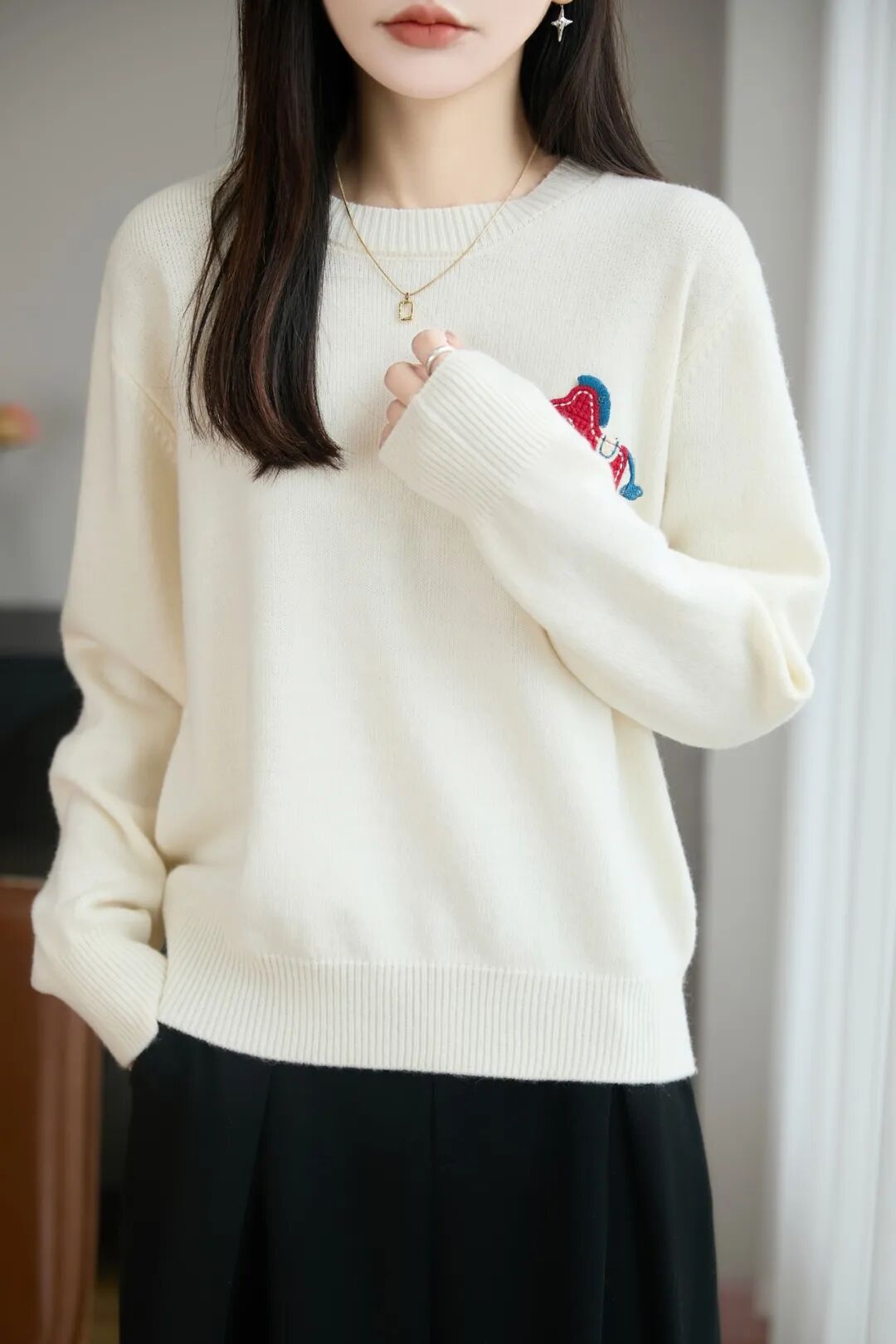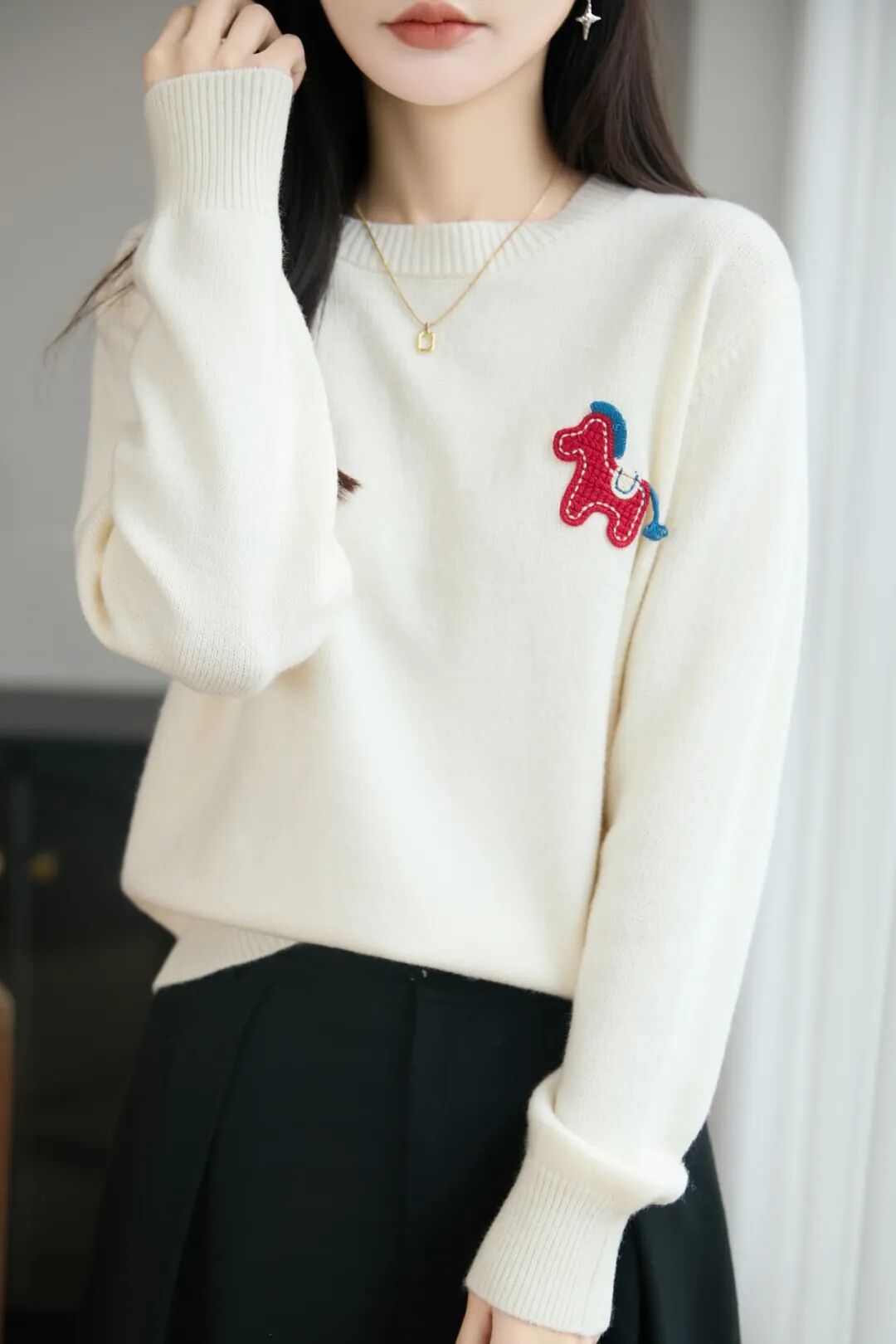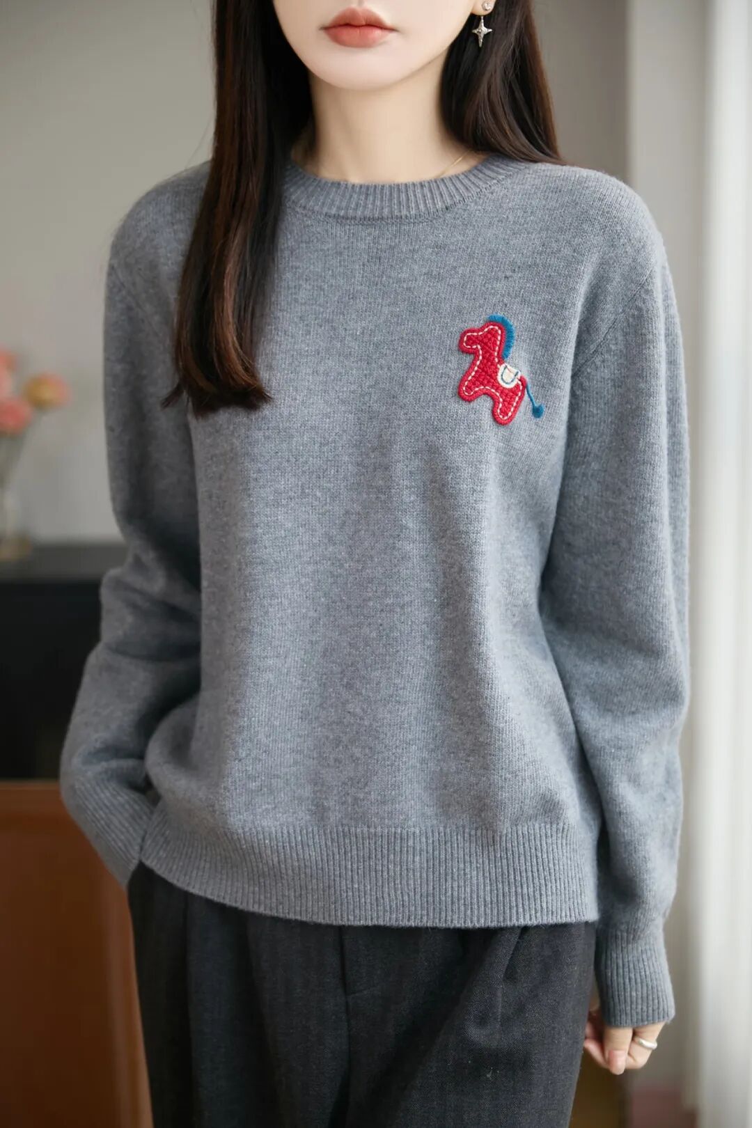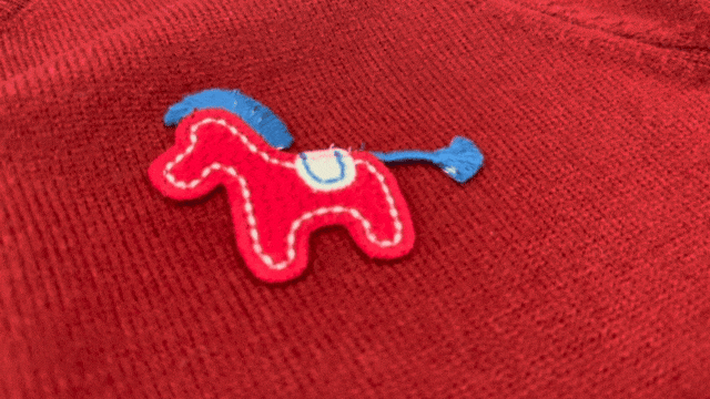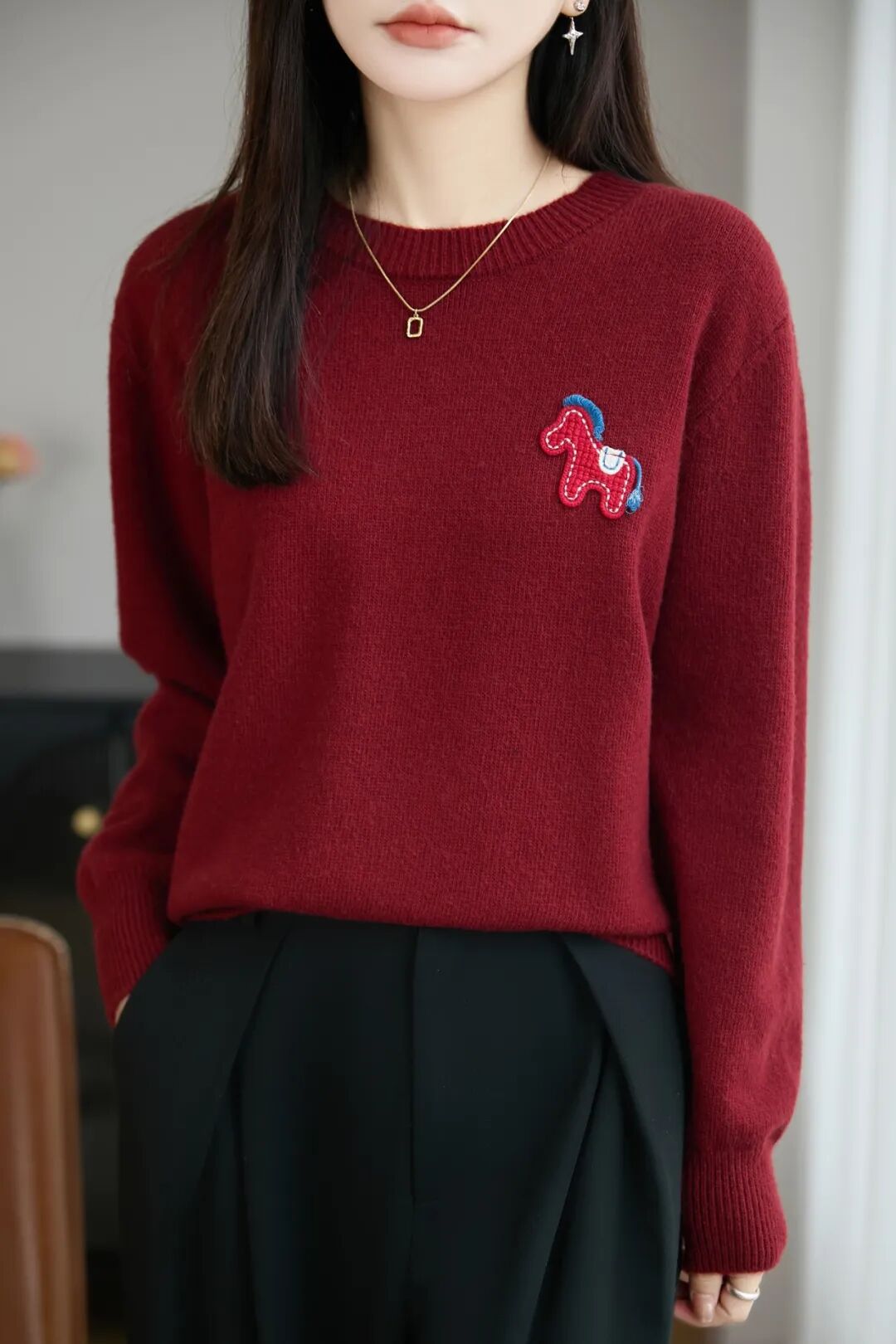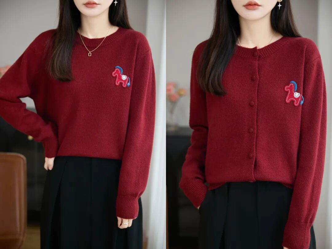 胸前红色的立体织线小马,为这件毛衣增添了一抹节日的喜庆!