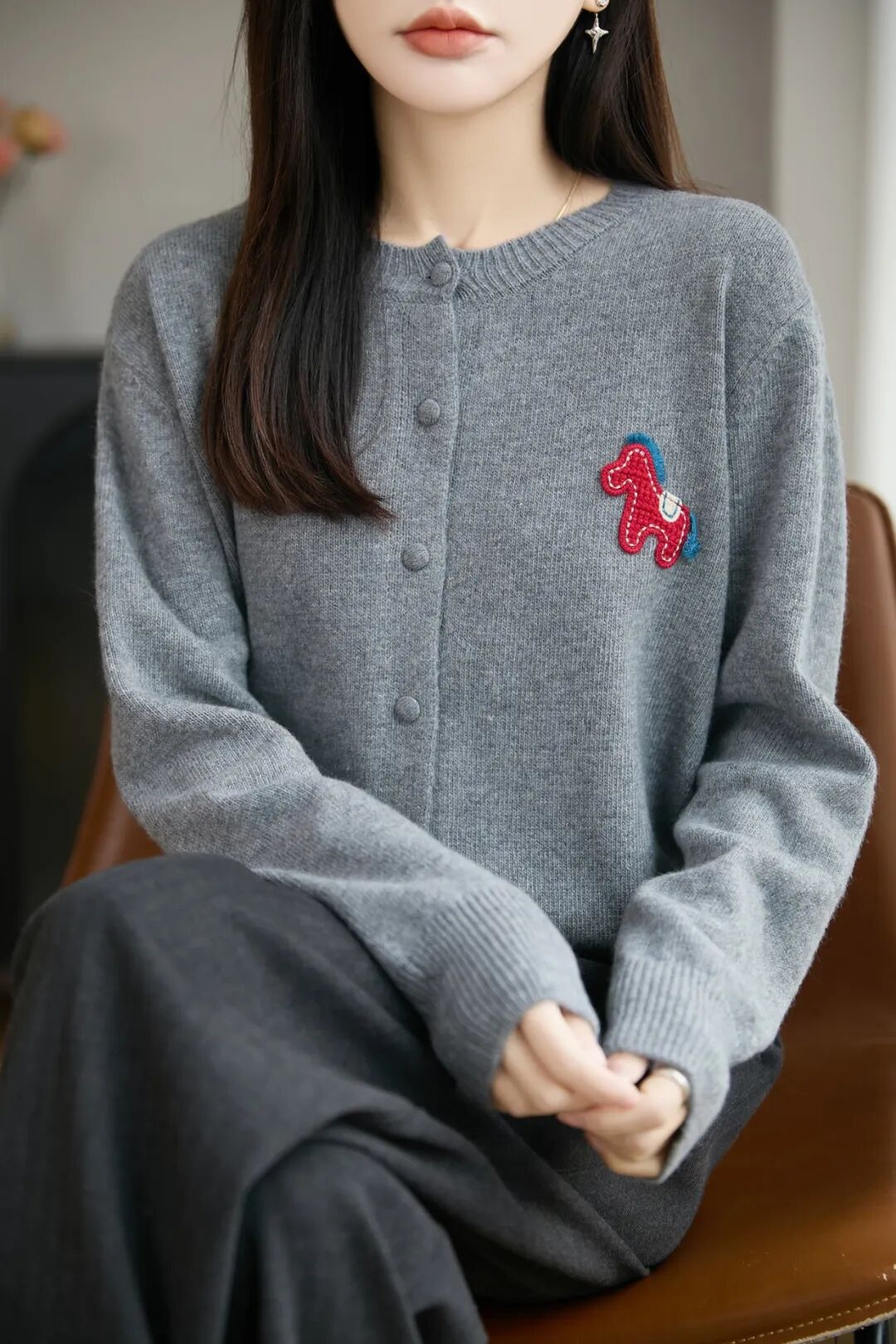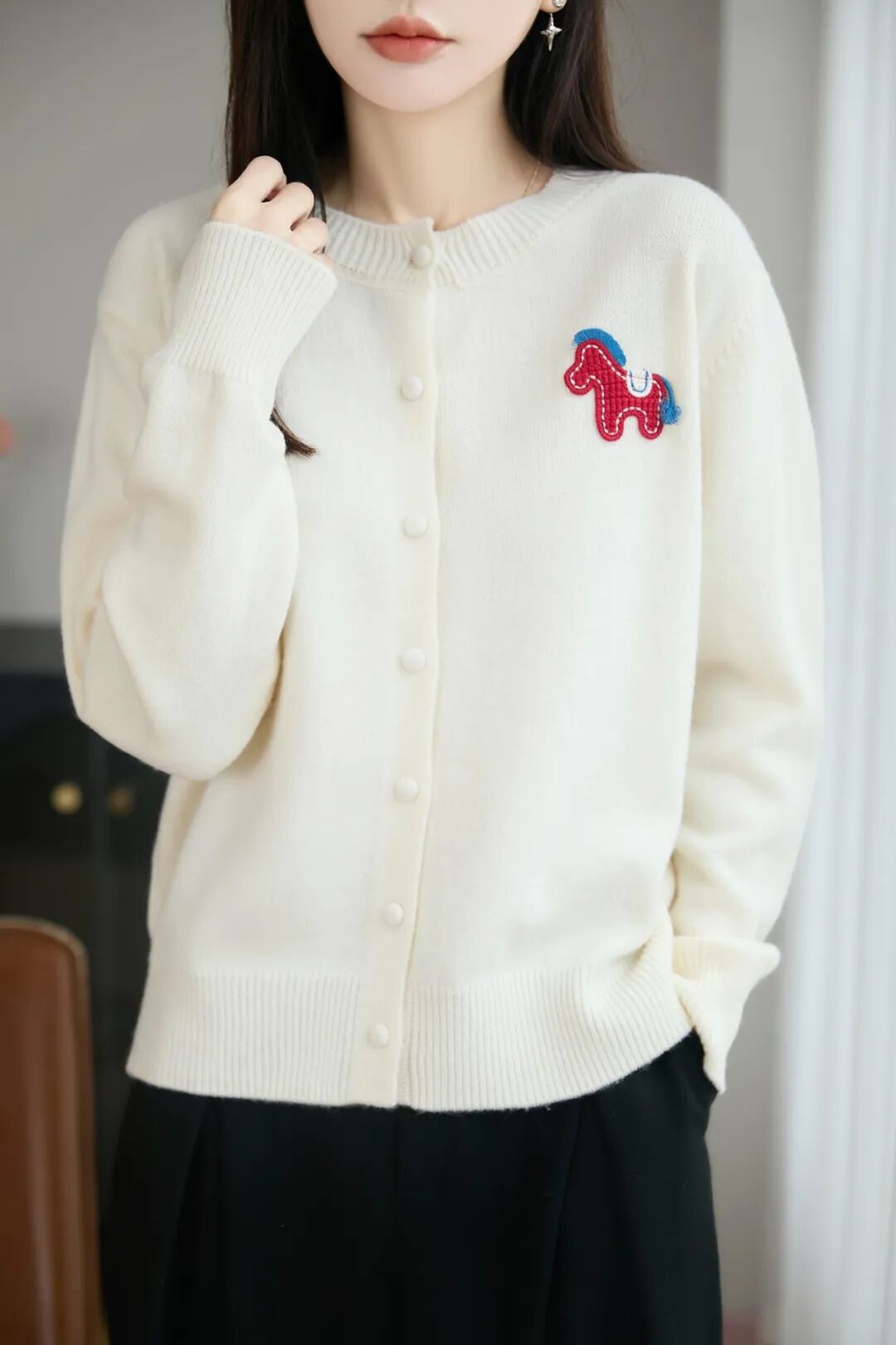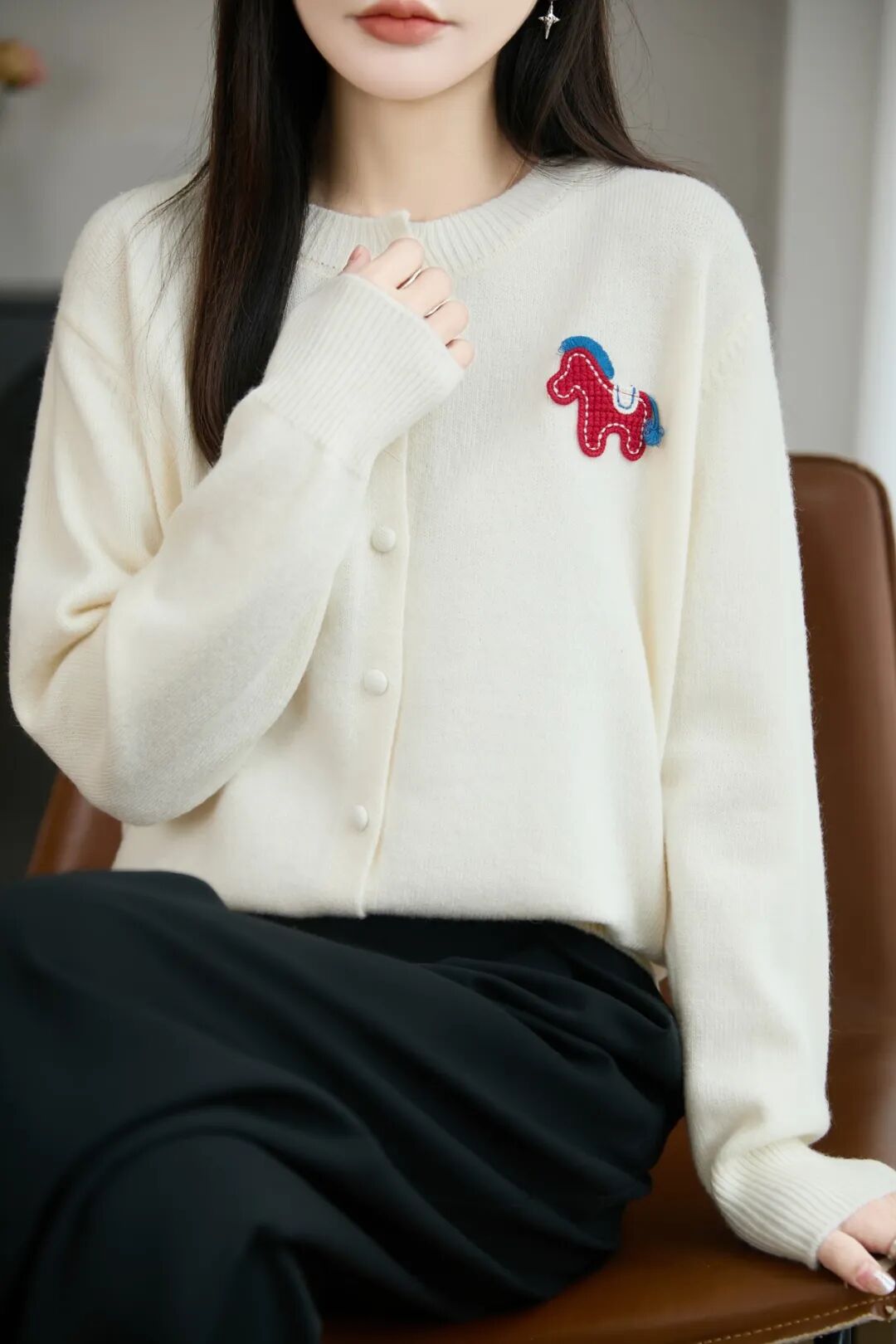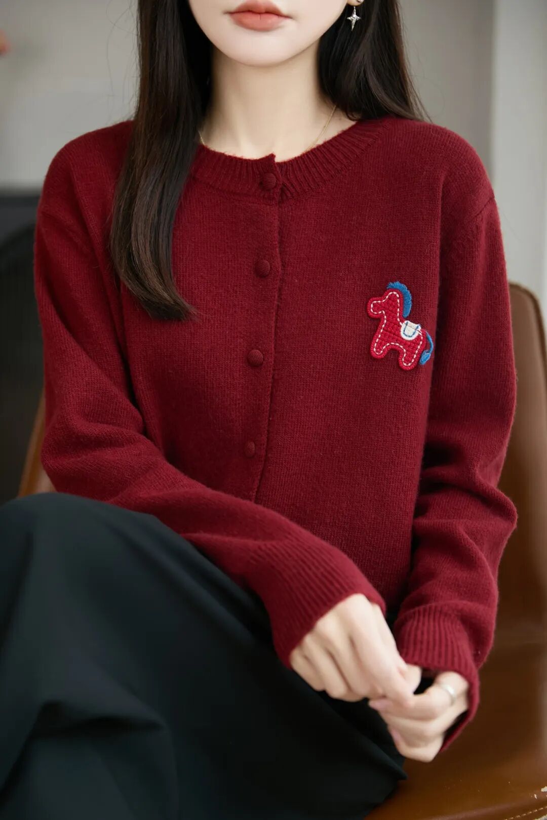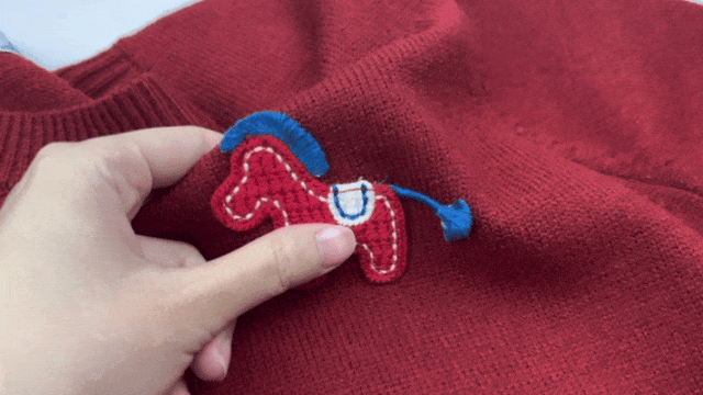 胸前那只红色的立体织线小马,远看是精致的装饰,近看栩栩如生,却不显突兀。