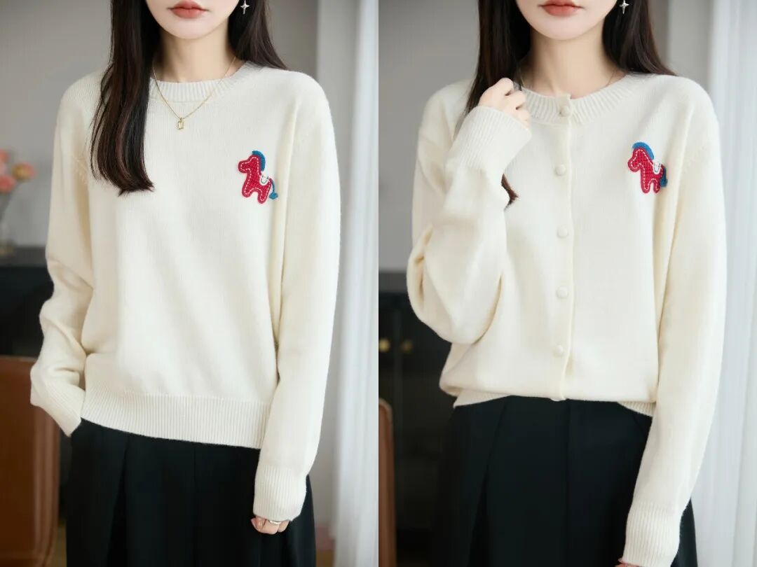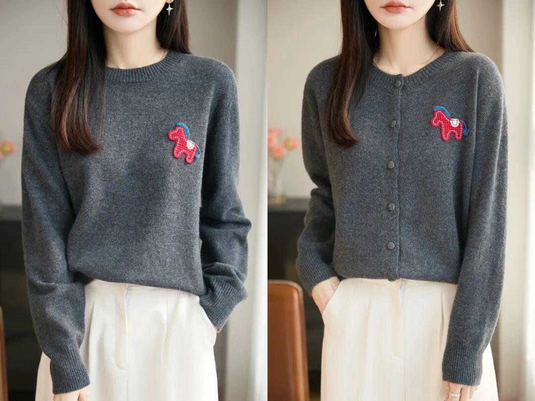 今天的这款蜜熊绒小马毛衣:圆领款、开衫款,面料、工艺设计几乎相同,只有套头和开衫的穿着区别。
