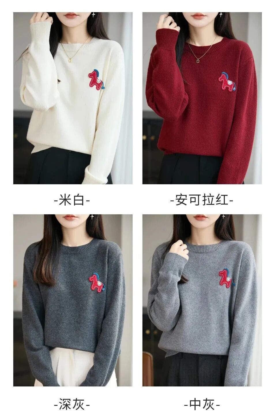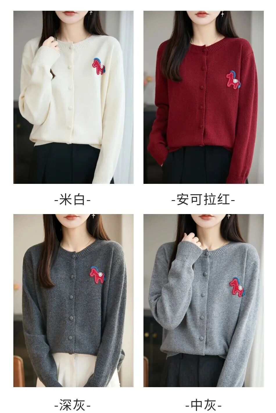 圆领款和开衫款颜色是相同的:安克拉红,米白,中灰,深灰。