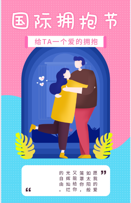 o内容类商家:以国际拥抱日,你最想拥抱谁?近几年来,全球各地也创立了越来越多“自由拥抱”(Free Hugs)的组织,邀请路人互相拥抱、共同传递温暖。那么在拥抱日这一天你最想拥抱谁,发起话题讨论
