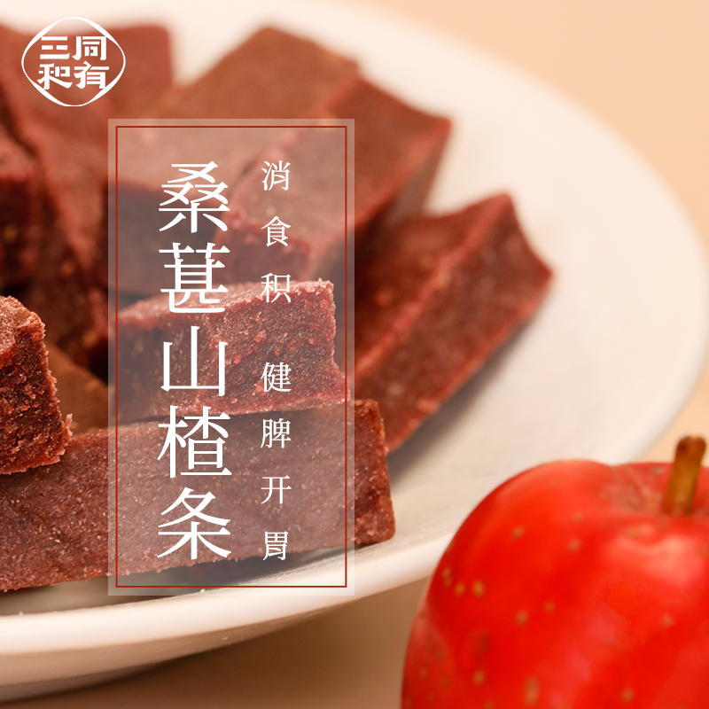 同有三和桑葚山楂条,以山楂、桑葚的鲜果制作,口感酸甜适中,运用鲜果使之多了湿润、柔软的感觉,风味更佳。