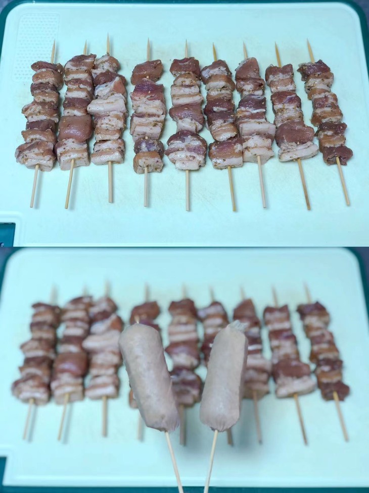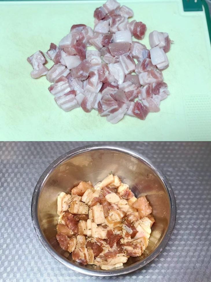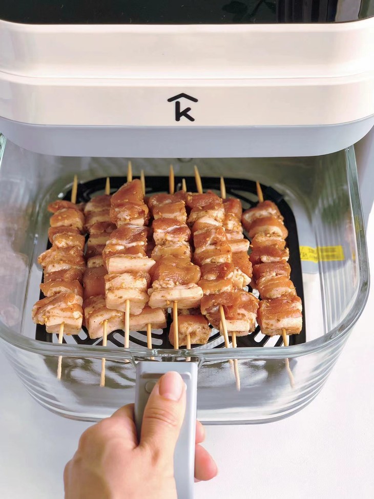 4、将腌制好的五花肉放入空气炸锅,注意距离