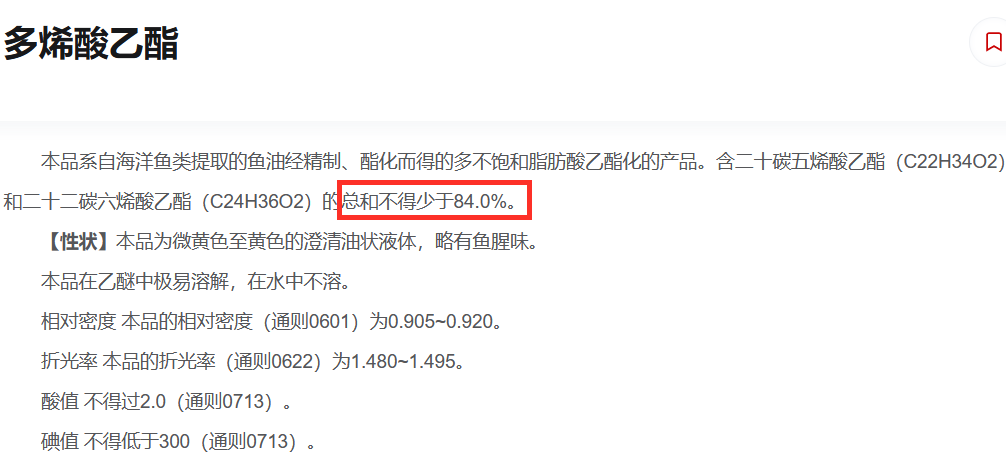 其实国家对药品级鱼油有严格的规定,依据《中国药典》2020年版二部规定,多烯酸乙酯类鱼油含EPA和DHA应不低于84%,才属于药品级别,所以很多Omega-3含量大于84%,但EPA和DHA含量低于84%又宣称自己是药品级鱼油是不准确的。