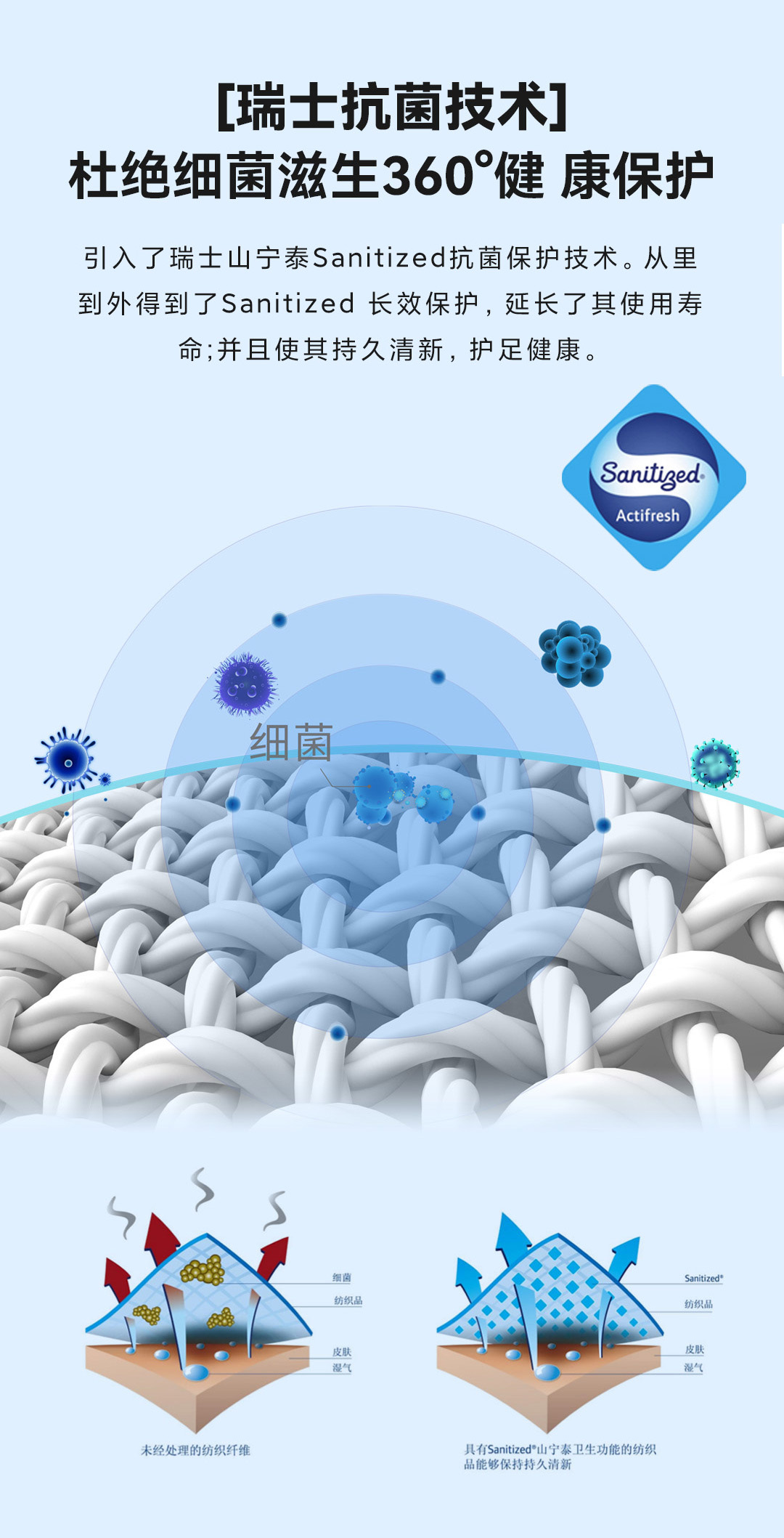 采用尖端永久性抗菌处理技术,有效抑制99%以上的细菌、真菌滋生。