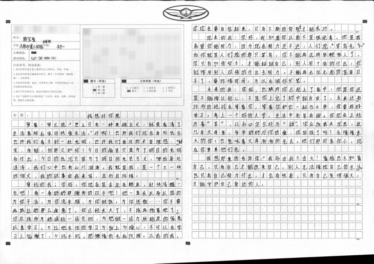 通过现实生活和未来生活相结合,并且站在事情的事实和所看到的表面相结合。把自己对自己的鼓励站在高中的自己的角度表达出来。加入宿舍的一些场景和这个年纪发生的一些事情更贴近于生活,告诉初三的自己是时候该再努力一把!“你很努力,但是请别放弃!”这句话自己会铭记在心!