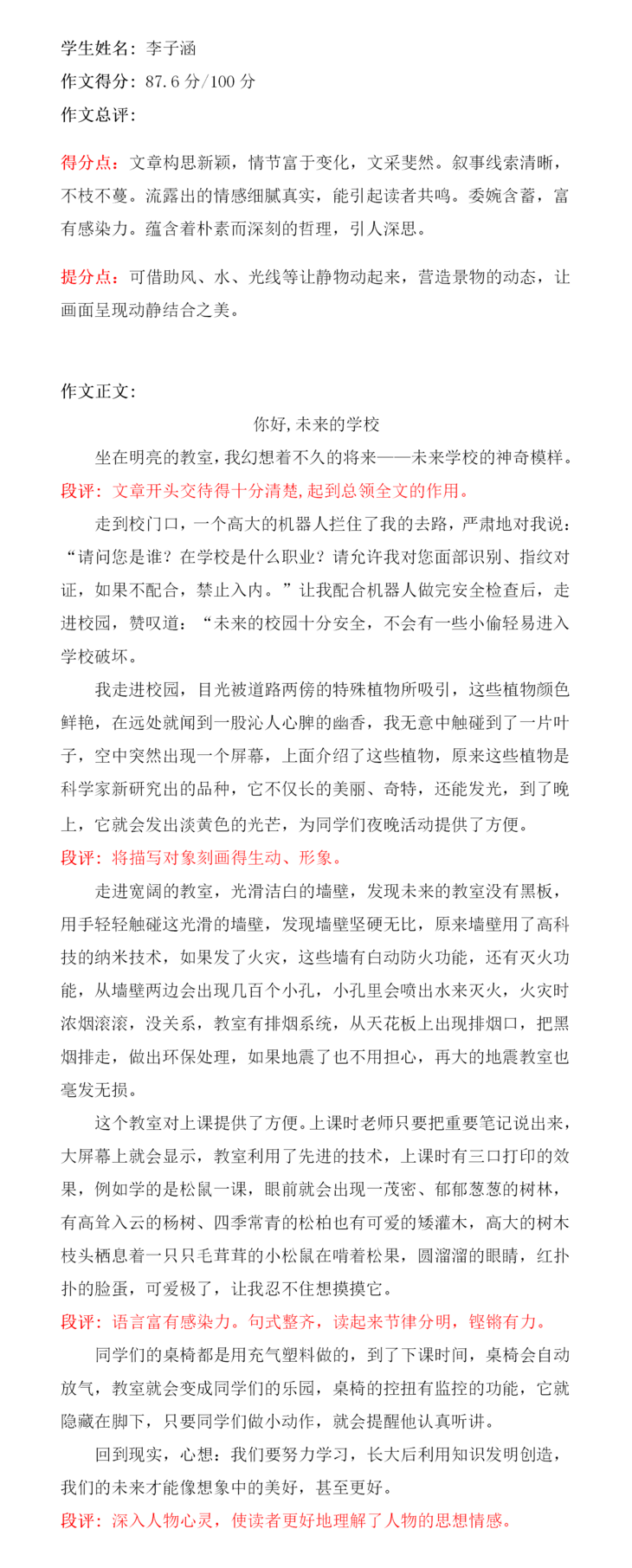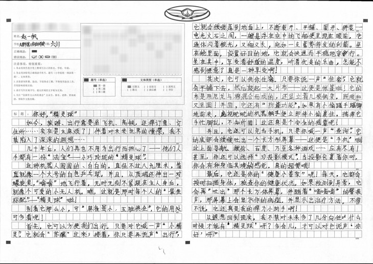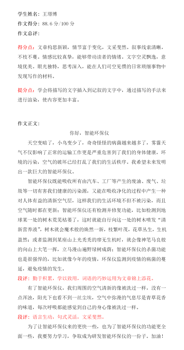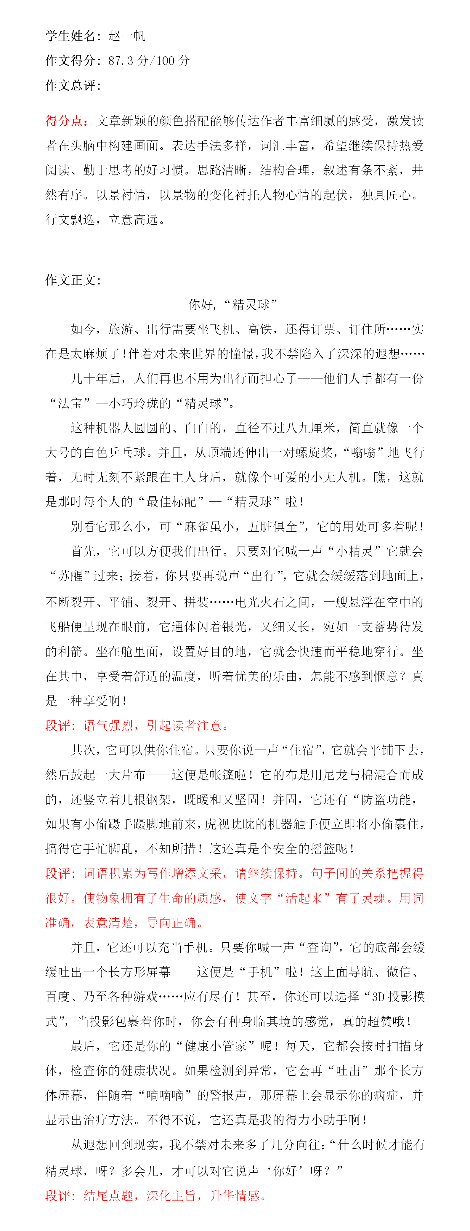 本文立足现实,面向未来,想象新奇。运用“首先”“其次”“最后”等表示顺序的词语,依次介绍了“小精灵球”的四个功能,使文章脉络清晰,思路条理。小赵同学,老师最希望乘坐你的小精灵球去旅游,体验一下“电光火石之间”小精灵球裂变成“悬浮在空中的飞船”的神奇感觉。为了美好的明天,你要加油呦!