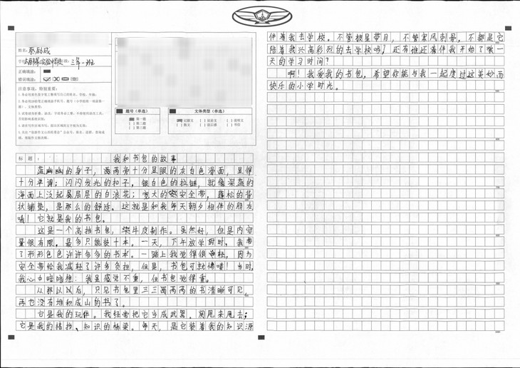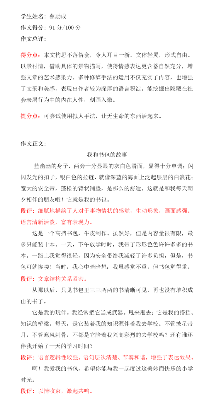 这篇习作行文流畅,构思新颖,以丰富的想象,生动的文笔写出了你与书包亲密真挚的情感。这一切离不开你平日里细心观察生活,善于思考以及读书的积累。
