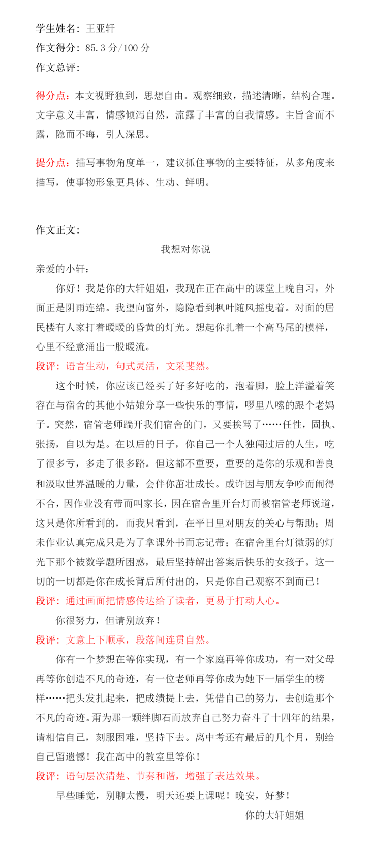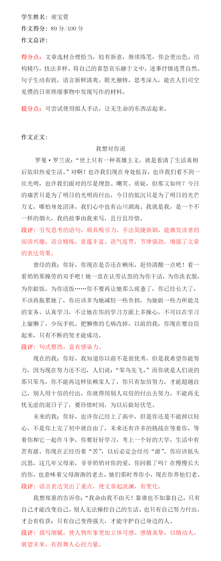 在老师心中,你是一个优秀的学生,也是一位善良、努力的孩子。立身以立学为先,立学以读书为本。希望以后的学习中,加强阅读,细心观察,多多积累。在追逐梦想的路上,再洒脱一点,保持勤勉,自信,成就美好的未来!