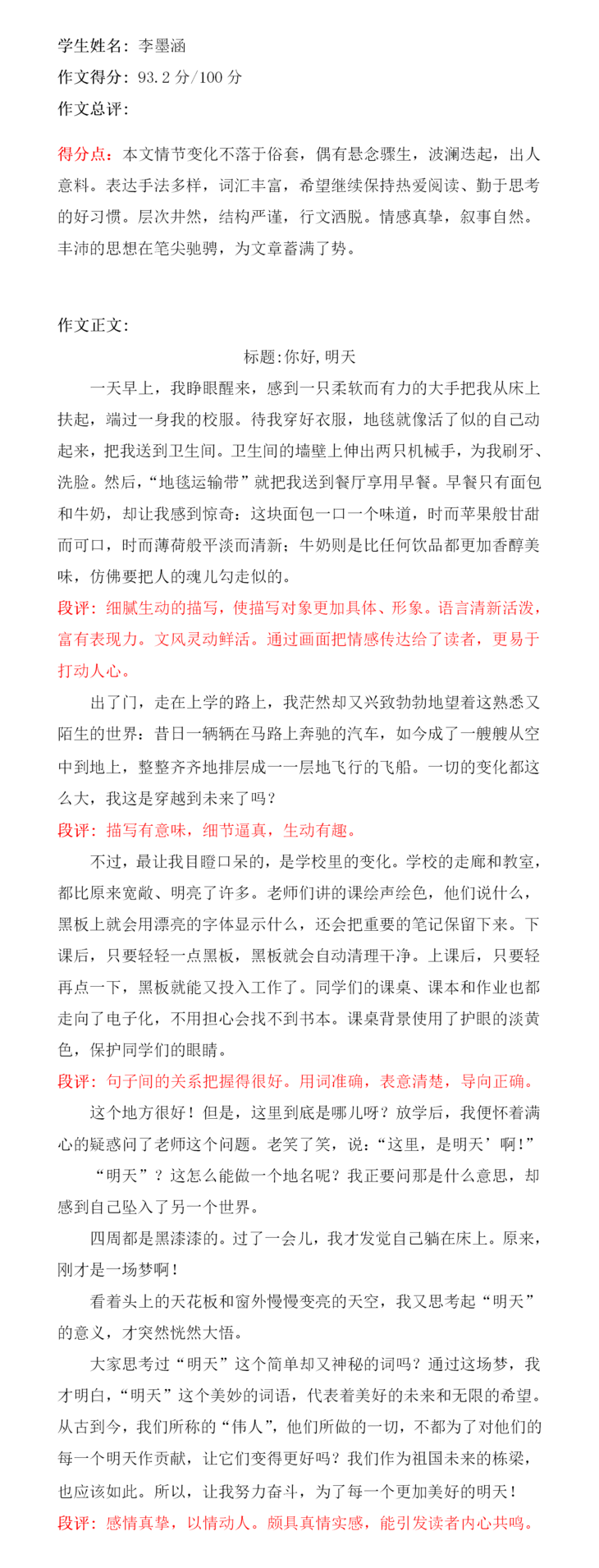 看到这次想象作文的题目“你好,——”,我想到了一句话:“为了每一个更好的明天。”顿时有了思路:“明天”可以代指 “未来”,我不如创造一个梦境中的空间,名字就叫“明天”,在那里完成我对未来的畅想,再以从梦中醒来的方式,回到现实,激励读者。这篇文章因此诞生。