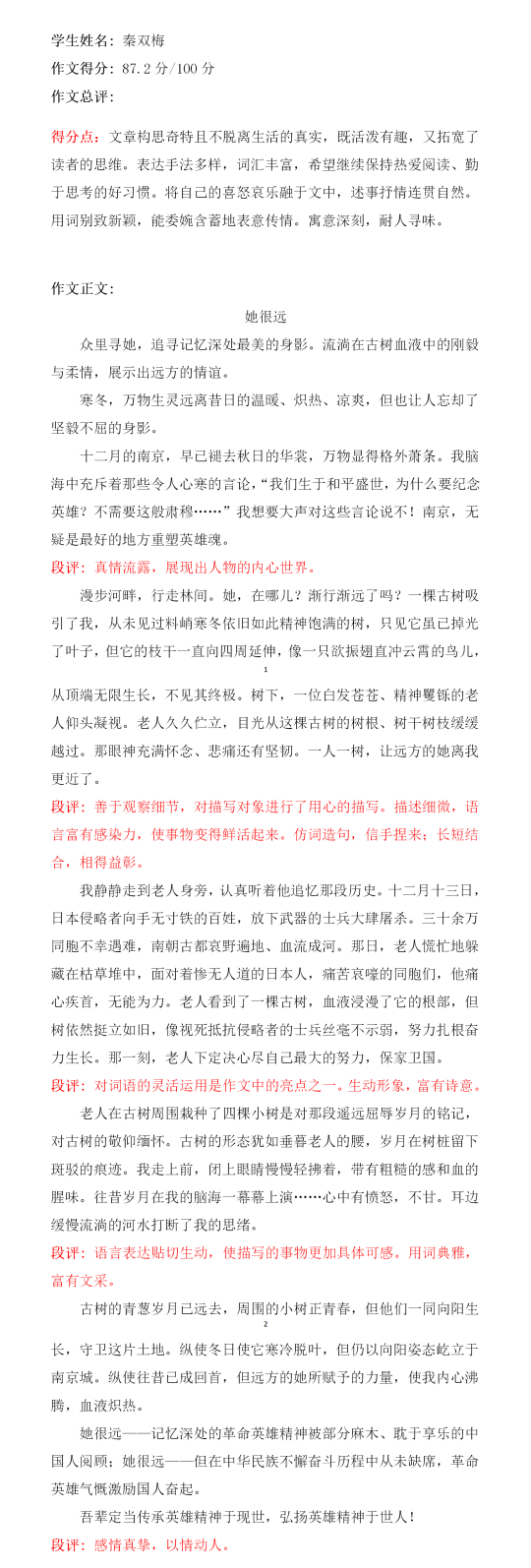 我思绪万千,漫步于林间,为古树、老人驻足,更是为革命英雄精神驻足。“她”很远,但是我深切地感受到了她的存在。它所赋予的力量跨越时空,历久弥新,使我热血沸腾。