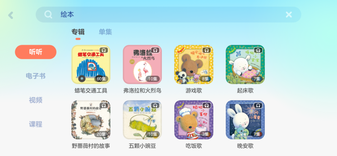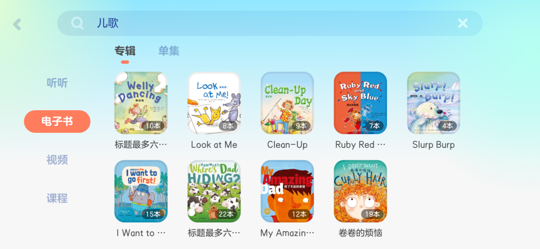 还可以根据关键词,比如输入“儿歌”,可以再进一步设定具体是要听听、电子书、视频还是课程。