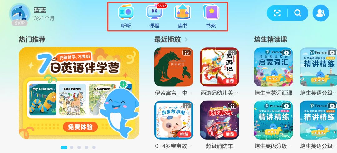那全新的儿童模式究竟又做了哪些优化和升级?这些改变又将怎样帮助孩子和家长们在家轻松开启早教启蒙,有效提升双语能力和培养阅读好习惯呢?话不多说,下面就从3大块来给爸爸妈妈们讲清楚。