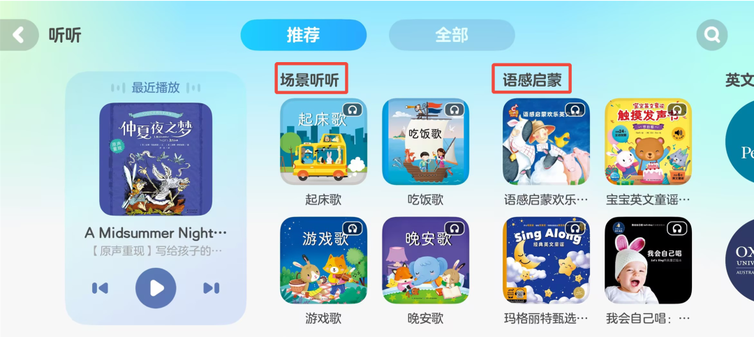 比如【听听】页面,可以按照孩子的个人兴趣,选择起床、吃饭、游戏、晚安等场景听听;也可以选择培生、企鹅兰登、羊驼拉玛、Muzzy等大牌英文原版资源专辑。