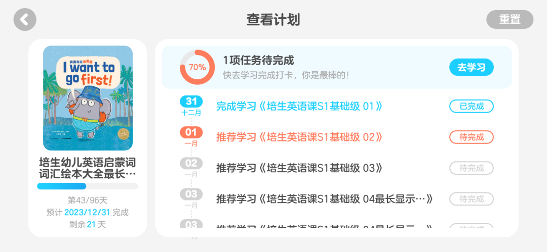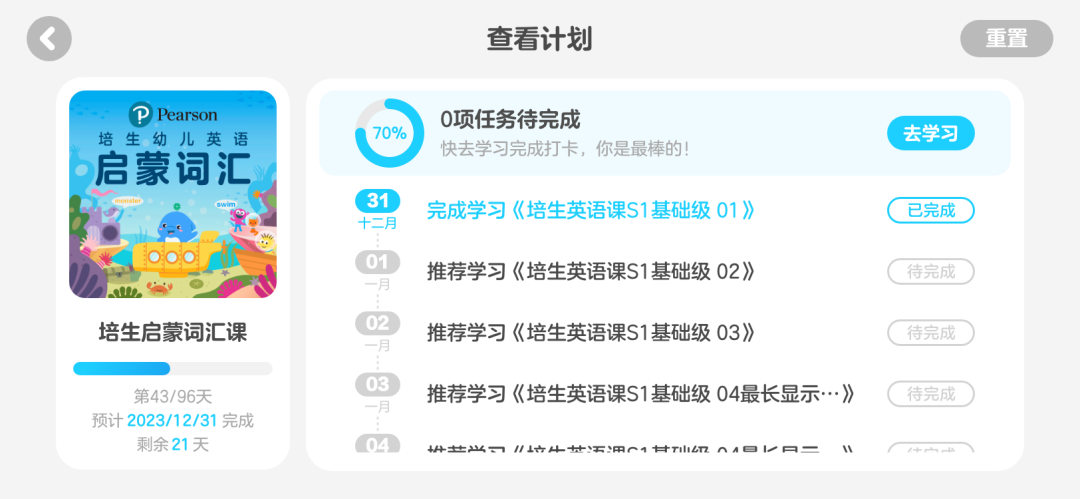 除了每日任务打卡提醒及时督促孩子,通过查看计划进度条,也方便家长随时帮助孩子灵活修改学习强度或是调整难度,设定更符合孩子目标进度的节奏。